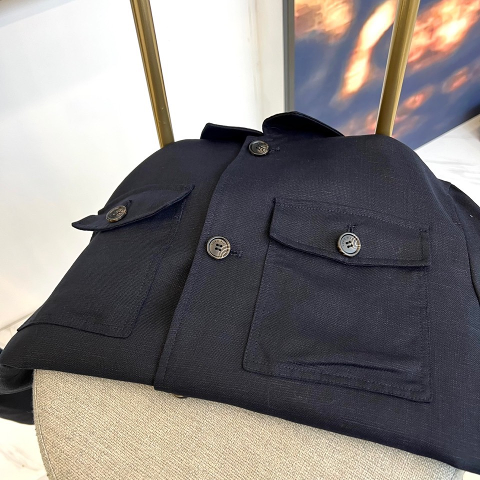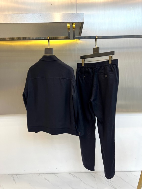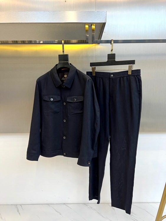 Loro Piana 2025 Fall/Winter minimalist beige suit. Innovative double-layer fabric, lightweight & warm. Notched lapel jacket, elastic-waist pants. Combines tech fabrics with heritage craftsmanship. Versatile urban luxury. Sizes 48-56.