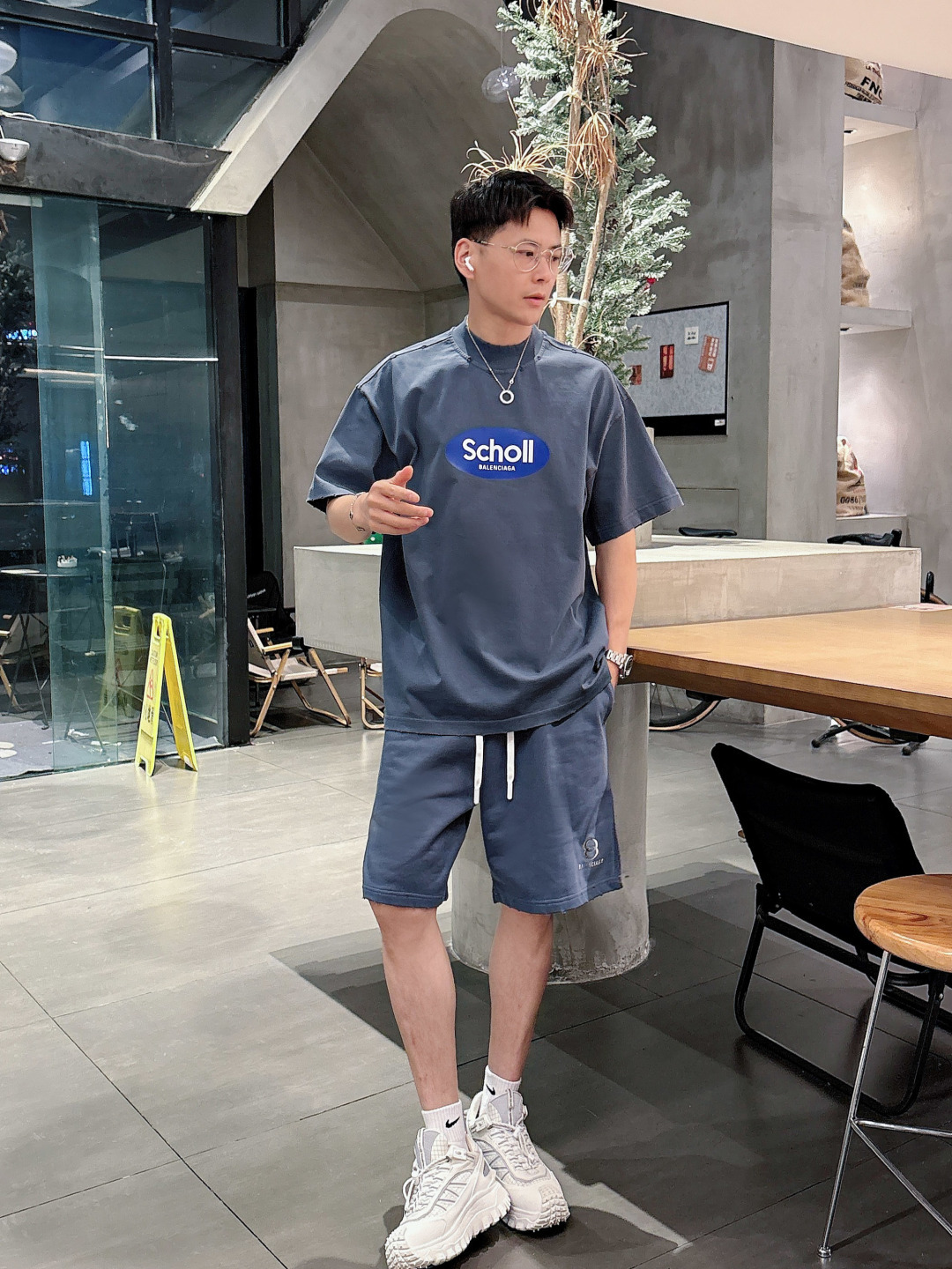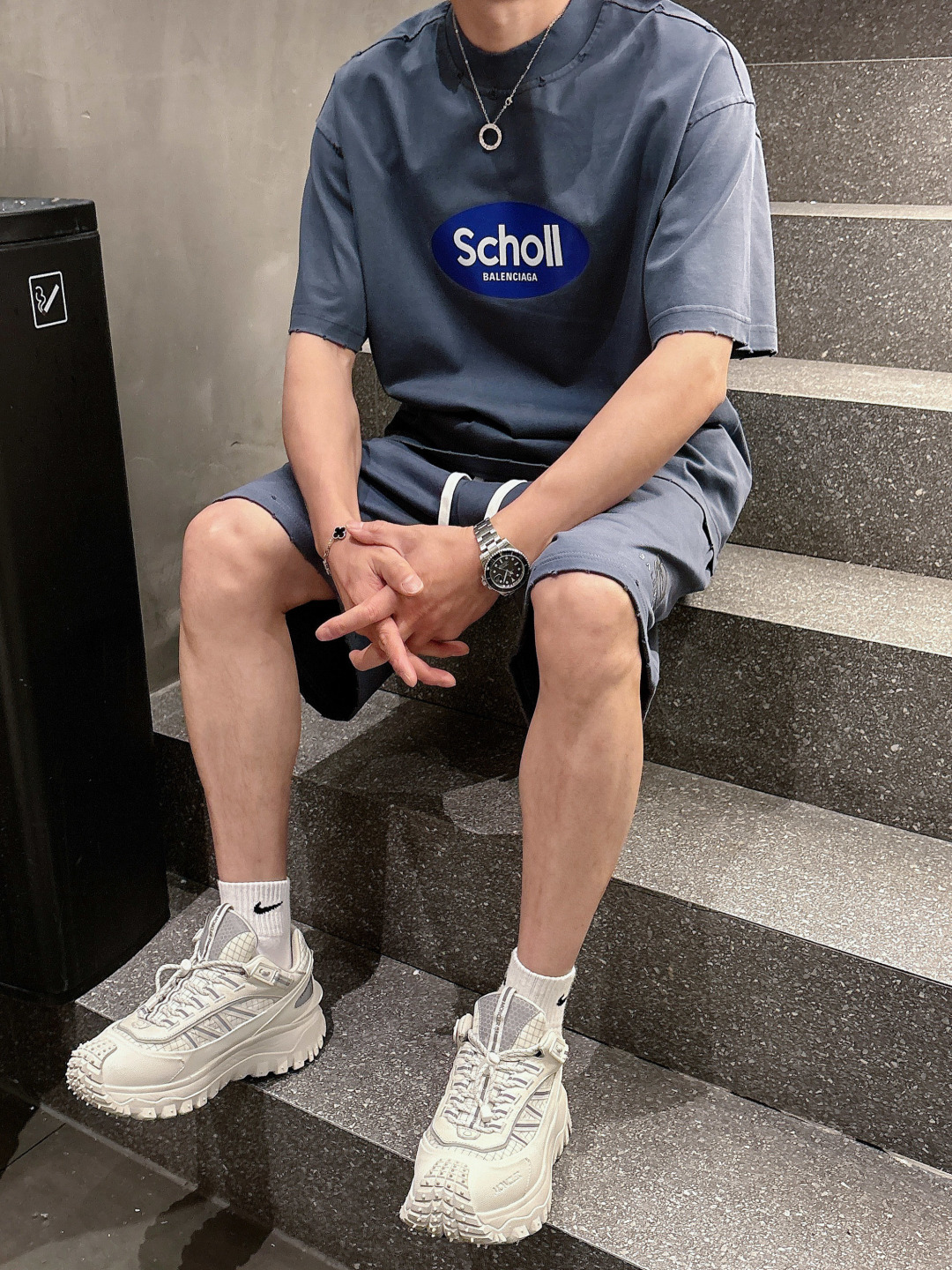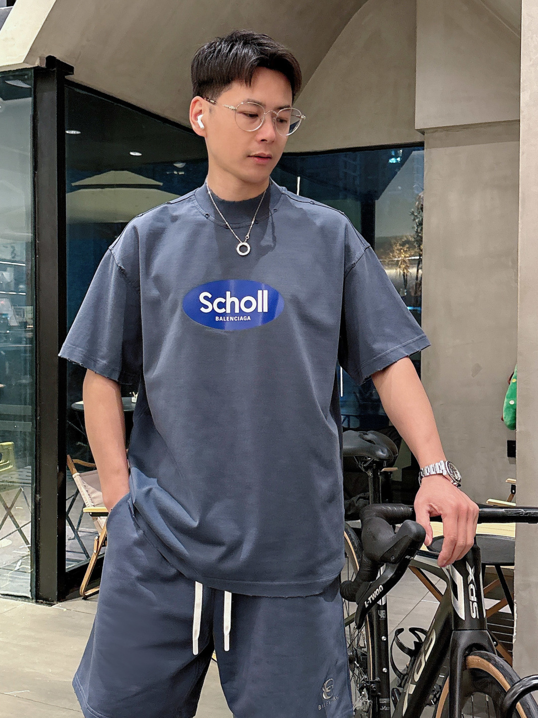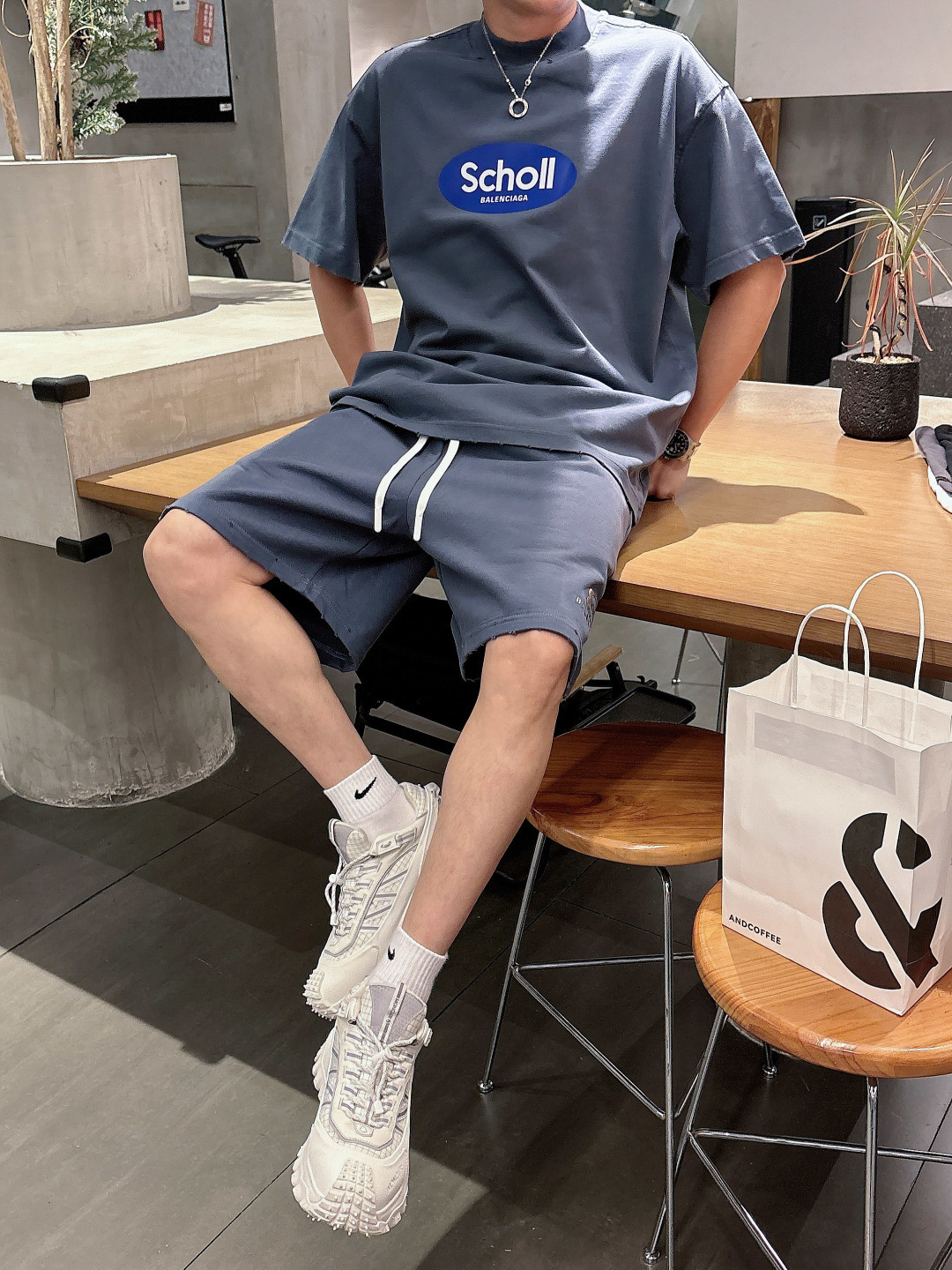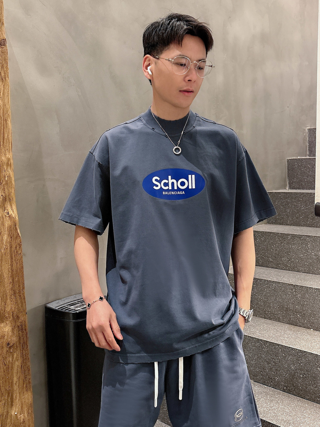 Balenciaga 2025 set: new wash, distressed. Short sleeve tee & shorts. Colors: Grey, Beige, Black, Green. Sizes: M-3XL (top), 29-38 (shorts).