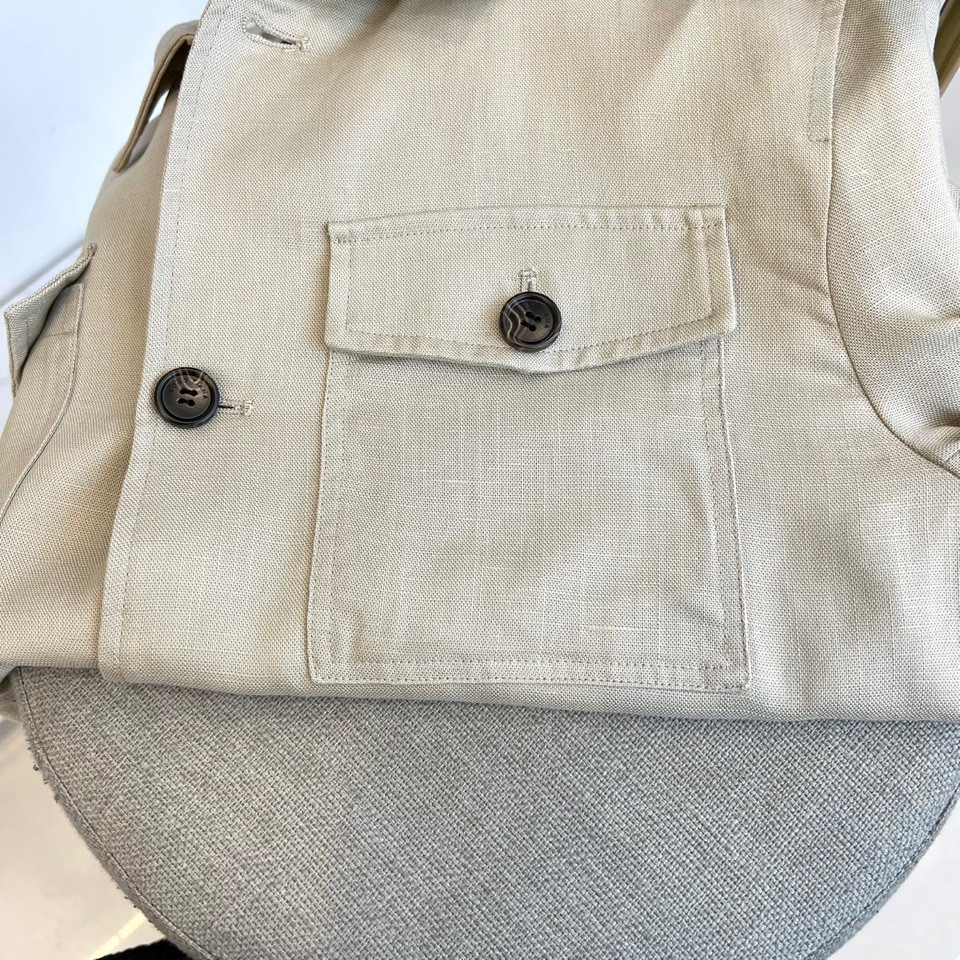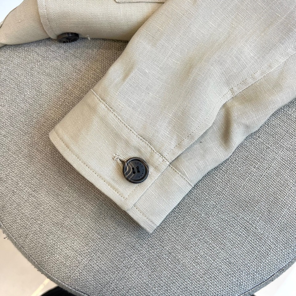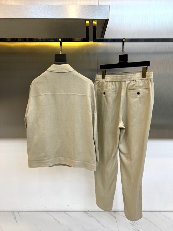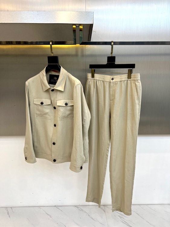 Home•Apparel•Suit•Loro Piana 2025 autumn-winter minimalist suit in light beige. Innovative double-layer fabric, lightweight and warm. Jacket with black resin buttons, trousers with elastic waist. Combines modern style and luxury.