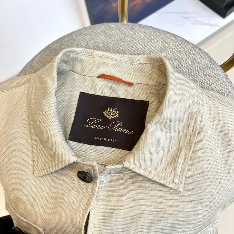 Loro Piana 2025 autumn-winter minimalist suit in light beige. Innovative double-layer fabric, lightweight and warm. Jacket with black resin buttons, trousers with elastic waist. Combines modern style and luxury.