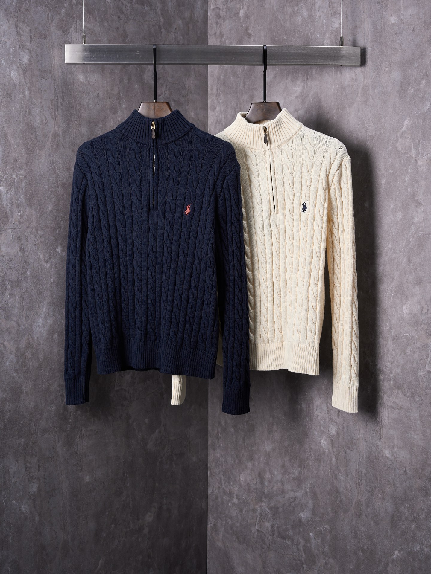 Ralph Lauren embroidered cable-knit half-zip sweater. Navy blue, classic polo pony logo. Soft cotton, tailored fit. Available in S M L XL.