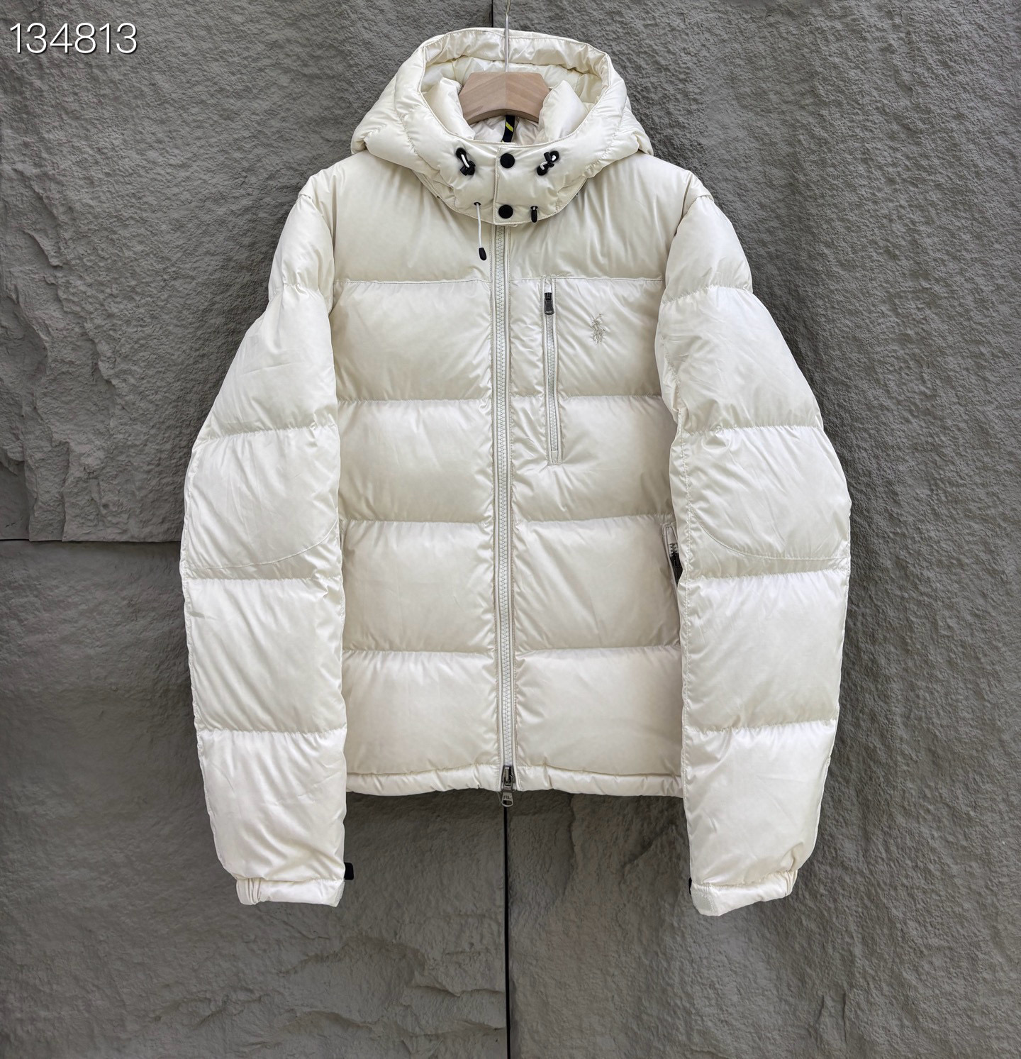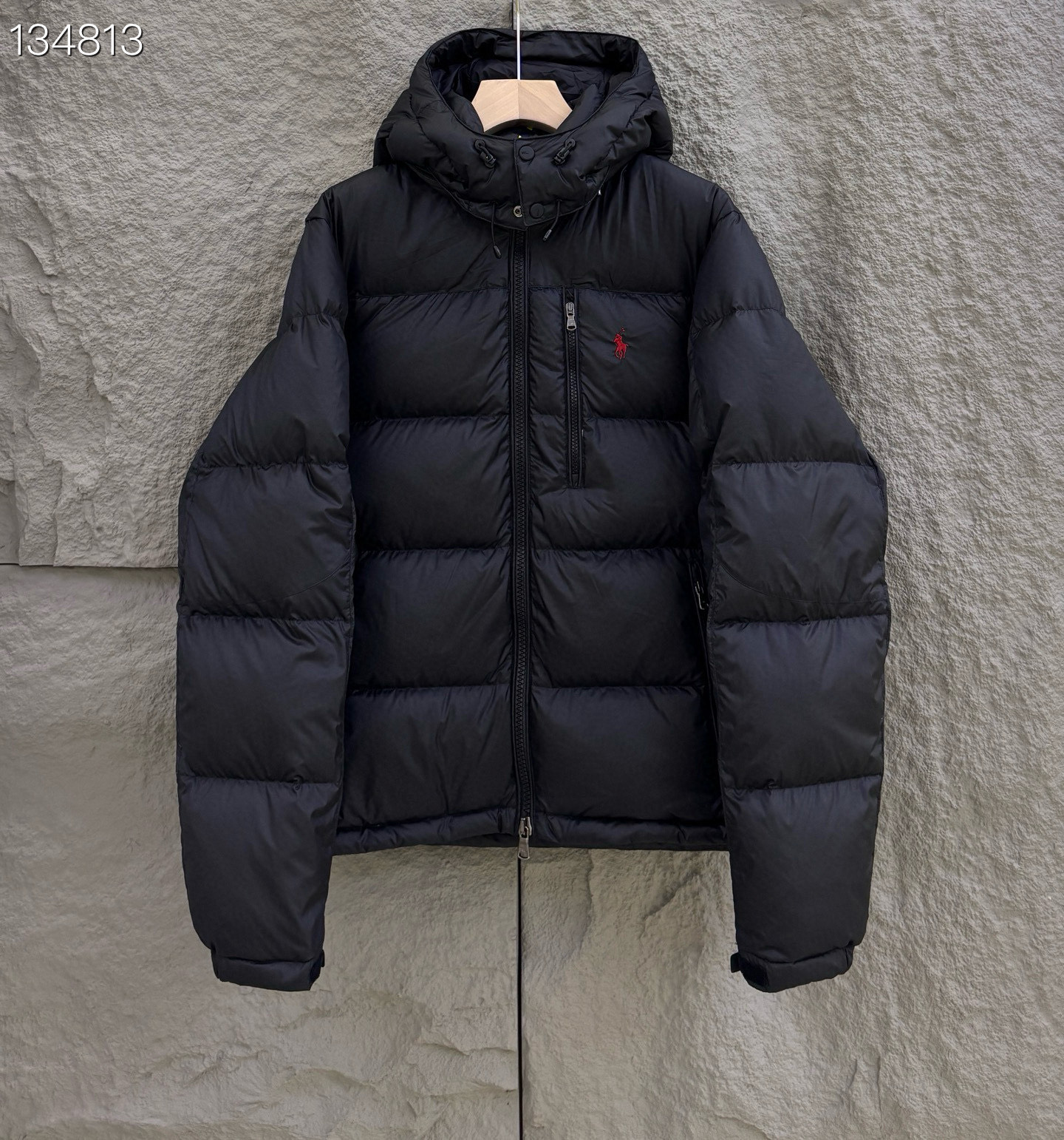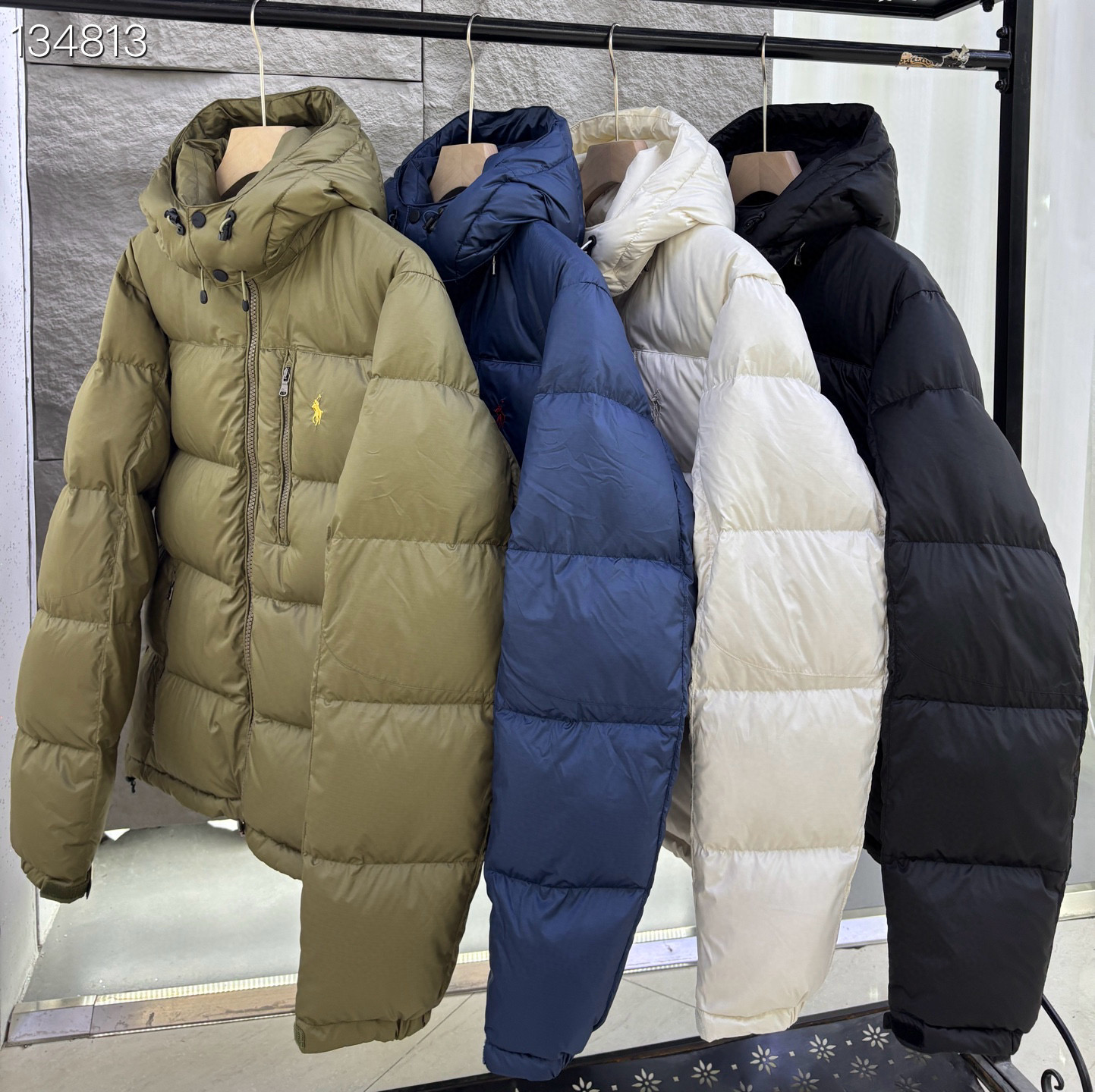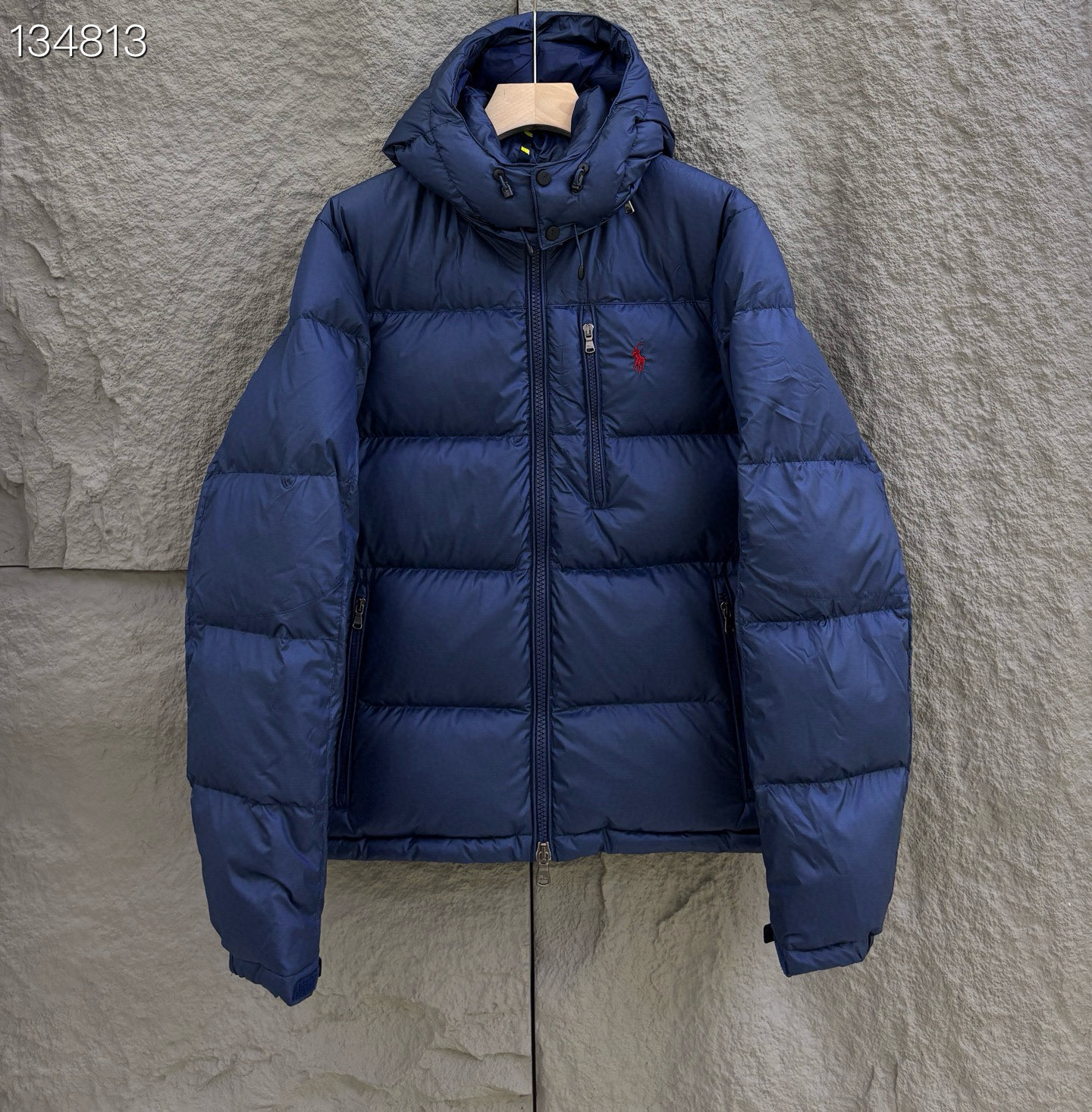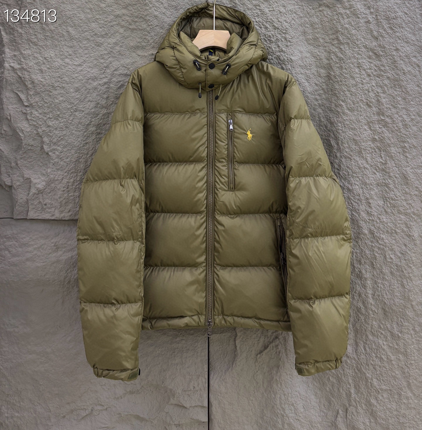 Ralph Lauren Gorham down jacket. Water-repellent, 650 fill power, detachable hood. Features zip pockets, adjustable cuffs, pony embroidery. Colors: black, beige, navy, olive. Sizes XS-XXL.