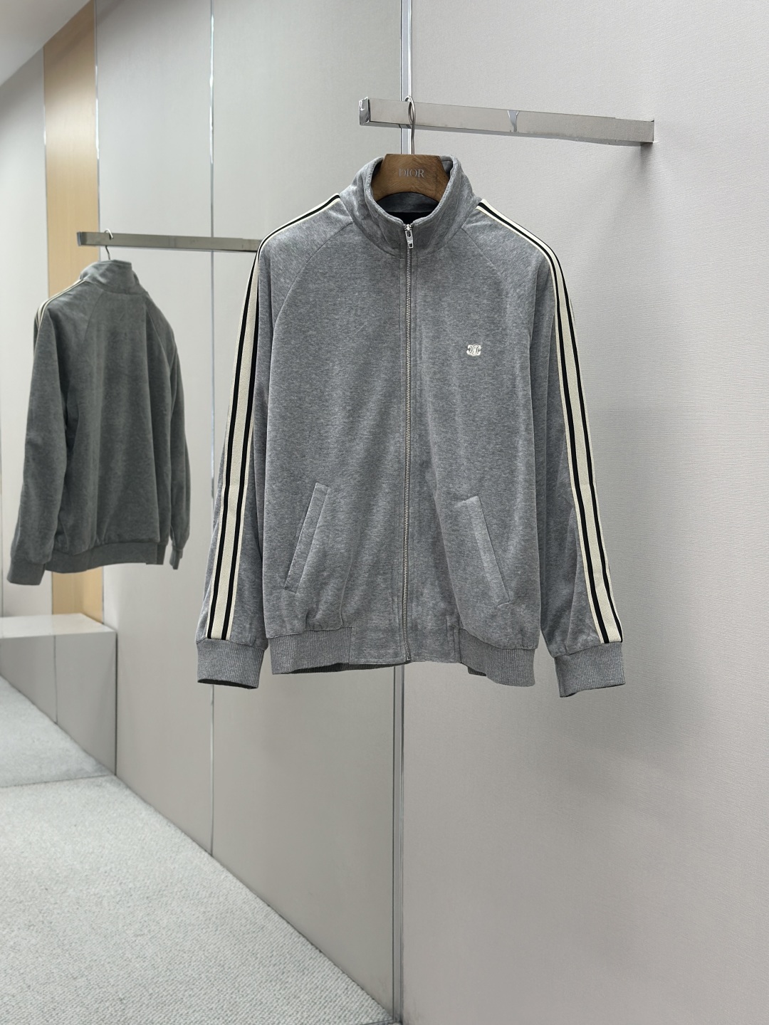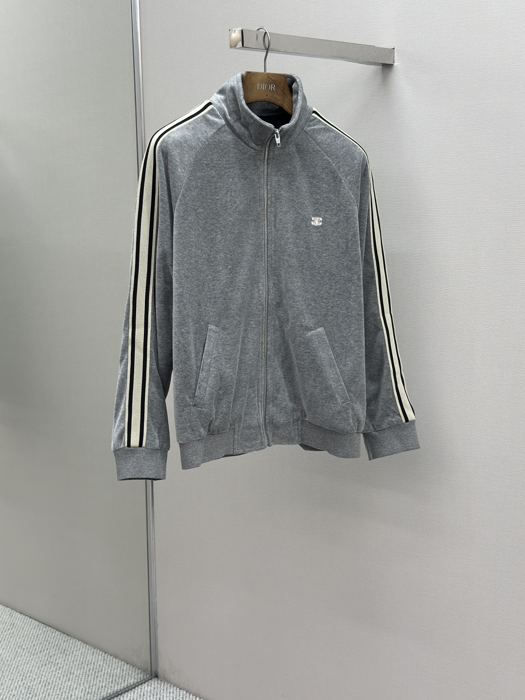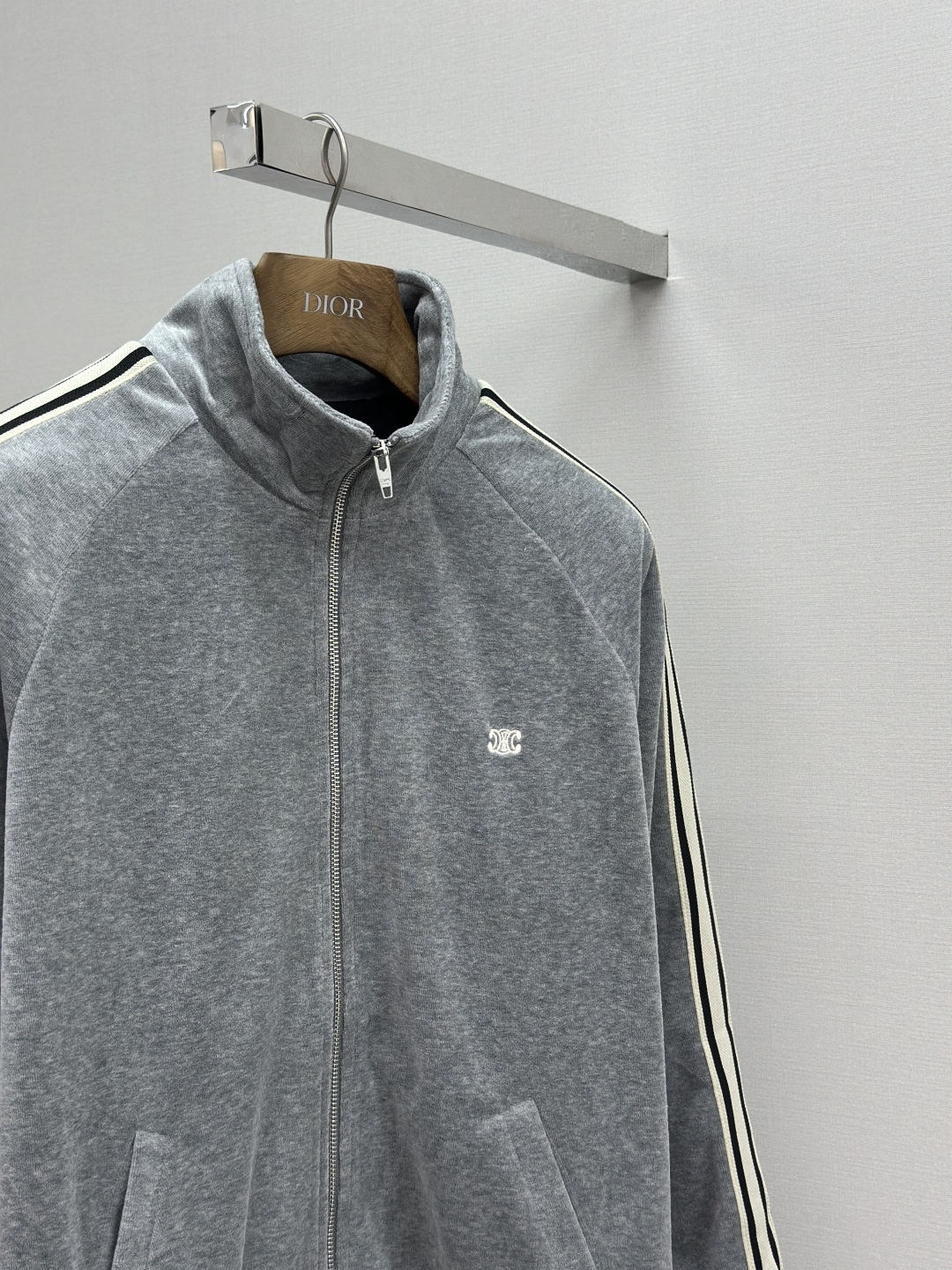 Custom cloud-soft twin-faced velvet cotton satin, exquisitely smooth and silky, skin-contact feels like being wrapped in clouds. Primarily in advanced gray as the base tone, low-key yet rich in connotation. The iconic CELINE Triomphe embroidery awakens on the gray mist velvet surface, offering full recognizability. Contrast color trim straps like meteors streaking across the shoulders and arms, metal zipper gleaming with a cold light, a visual impact between movement and stillness. The stand-up collar cuts a clean line, balancing strength and softness. Worn separately, it's a style piece; worn together, it's an aura battle robe. A set for attendance, worry-free styling.