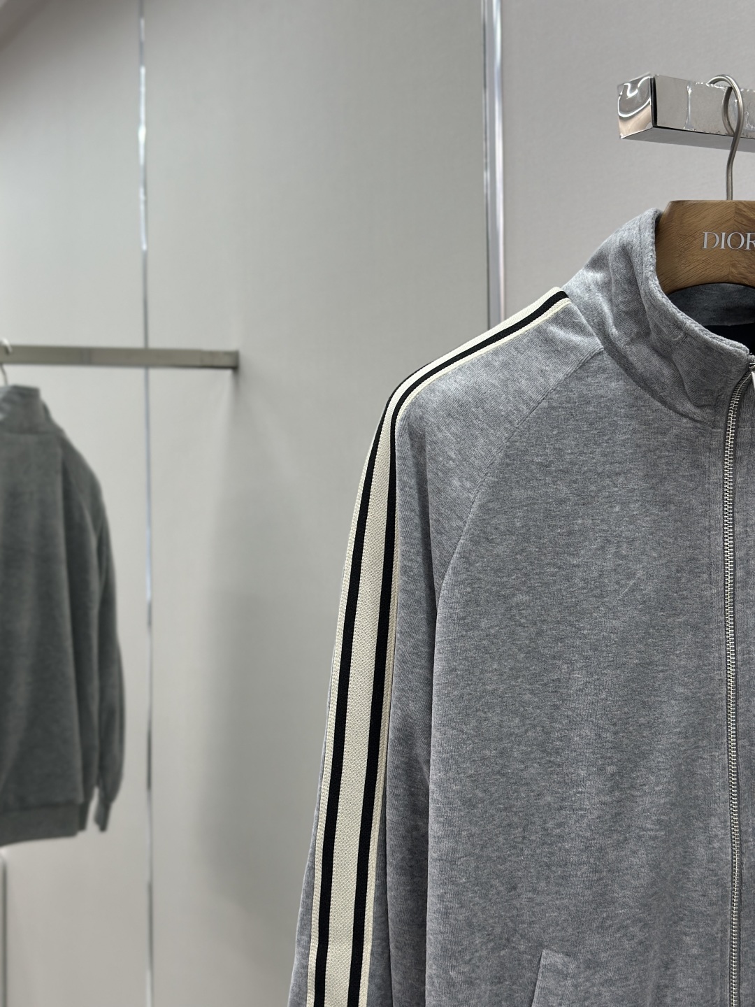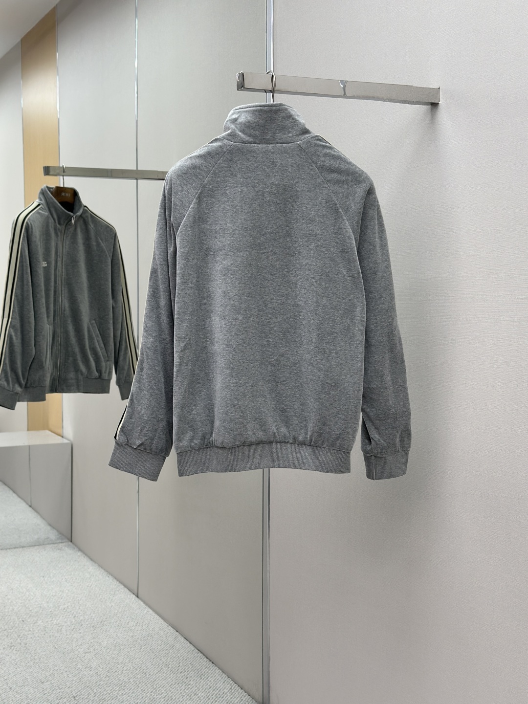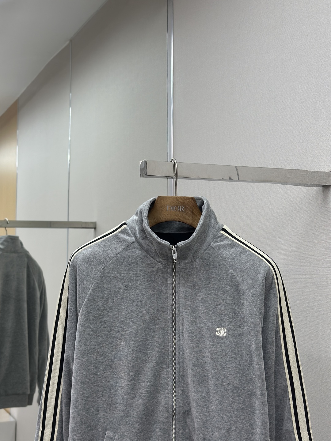 Custom cloud-soft twin-faced velvet cotton satin, exquisitely smooth and silky, skin-contact feels like being wrapped in clouds. Primarily in advanced gray as the base tone, low-key yet rich in connotation. The iconic CELINE Triomphe embroidery awakens on the gray mist velvet surface, offering full recognizability. Contrast color trim straps like meteors streaking across the shoulders and arms, metal zipper gleaming with a cold light, a visual impact between movement and stillness. The stand-up collar cuts a clean line, balancing strength and softness. Worn separately, it's a style piece; worn together, it's an aura battle robe. A set for attendance, worry-free styling.