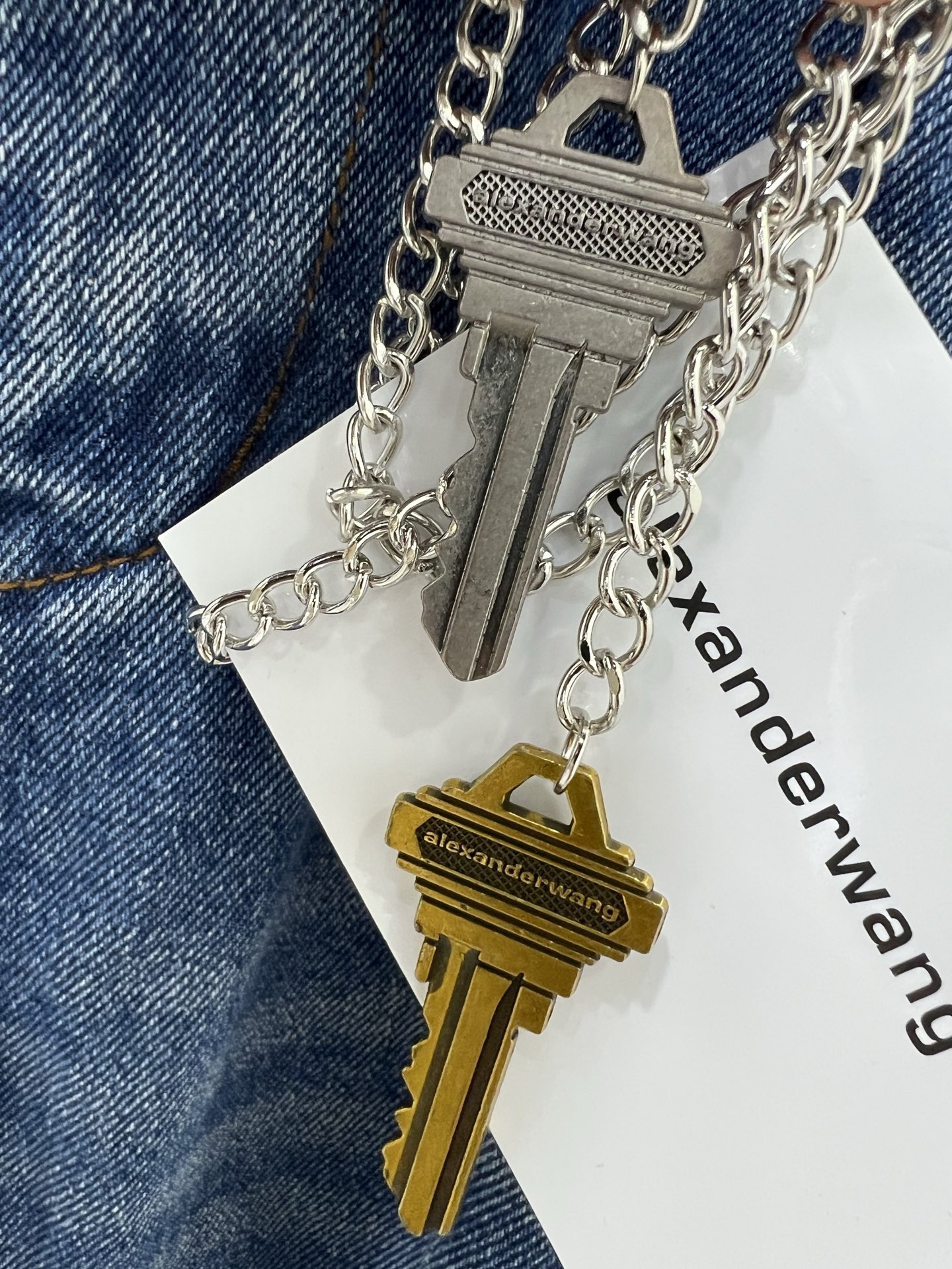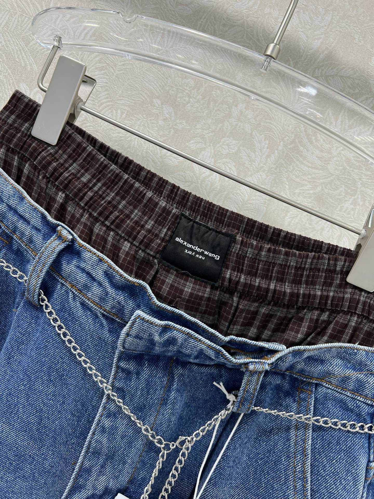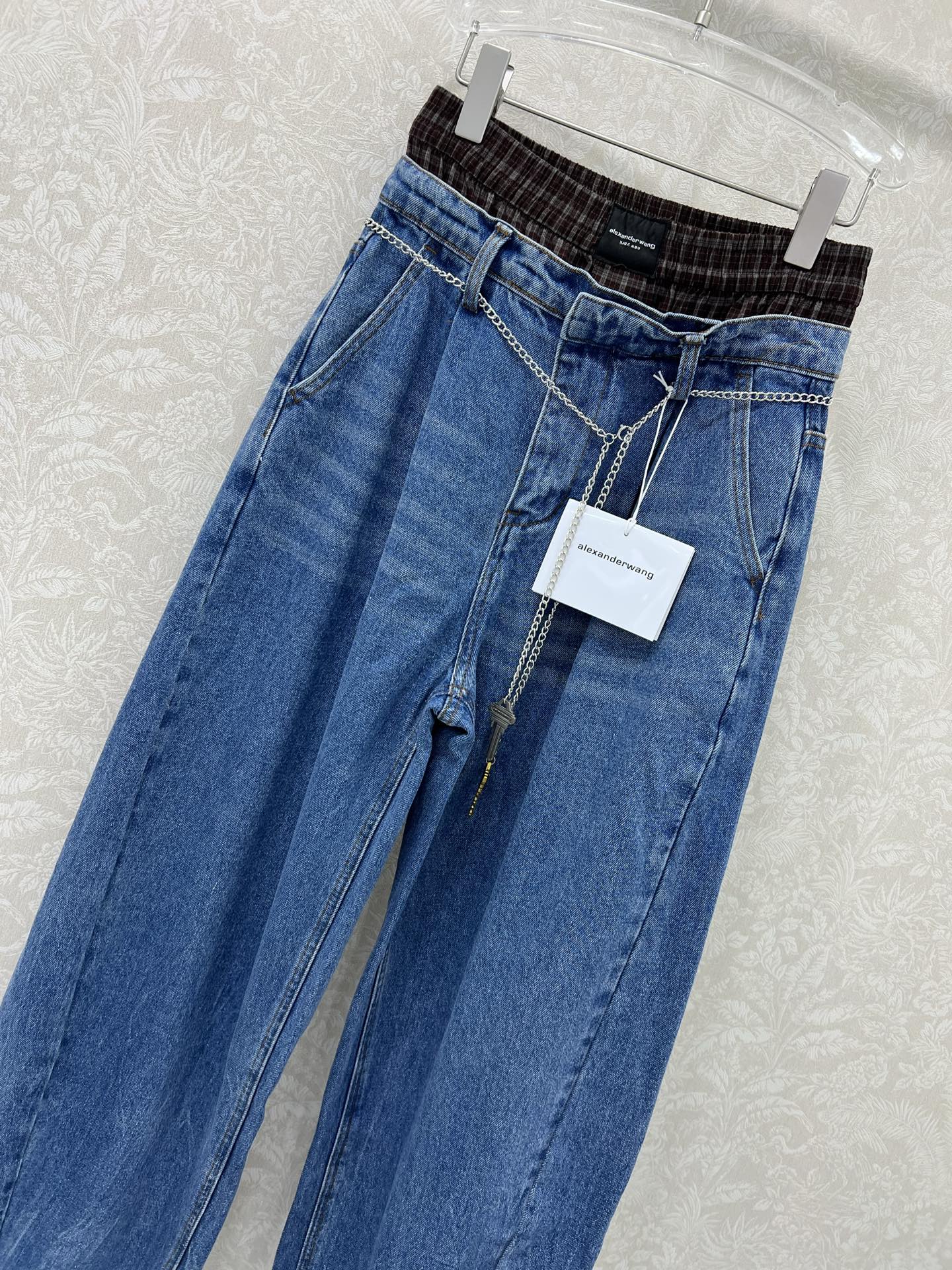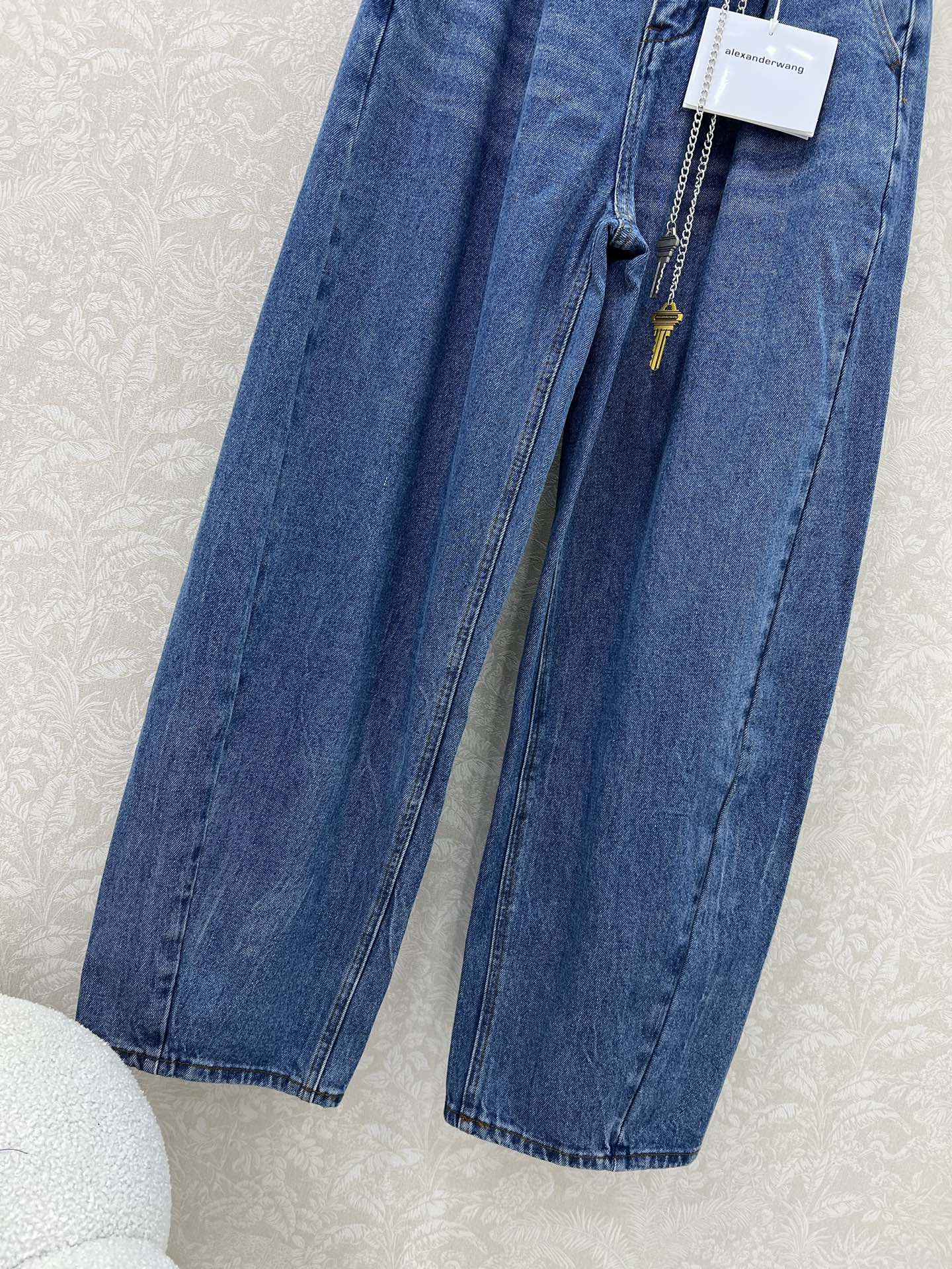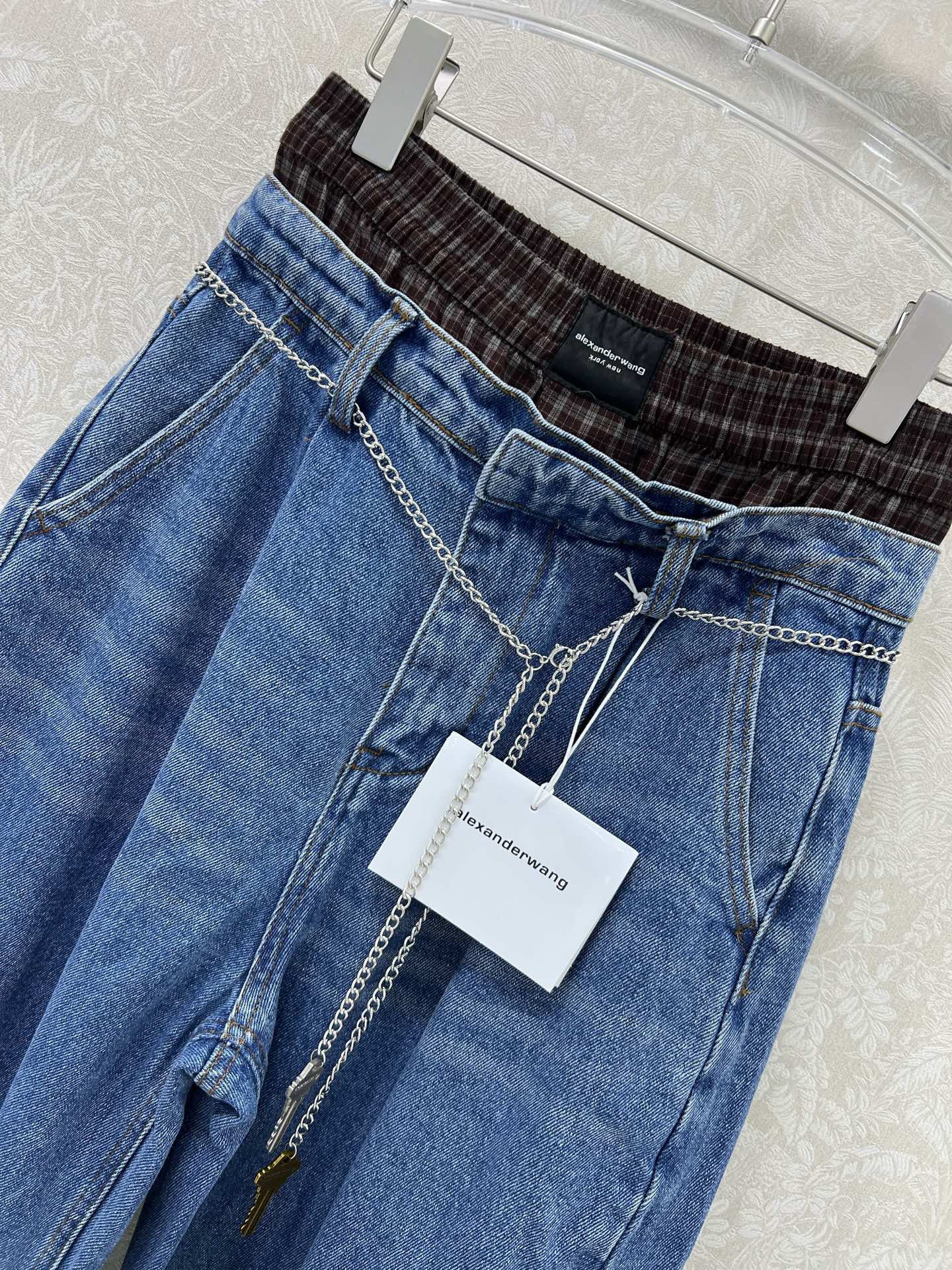 Alexander Wang's 25 new double waistband curved knife jeans, custom waist chain key decoration. Made with a high proportion of cotton fabric, the material is delicate, soft, rich, thick, and tightly woven, giving the fabric a twill texture. Wearing them gives a structured and stylish look, with a three-dimensional cut that instantly enhances the buttocks and elongates the legs. The mid-to-high waist design elongates the leg proportion. The full diamond craftsmanship is very exquisite. Pairs well with multiple series of jackets, suitable for daily wear and fashion. Single color, 3 sizes SML.