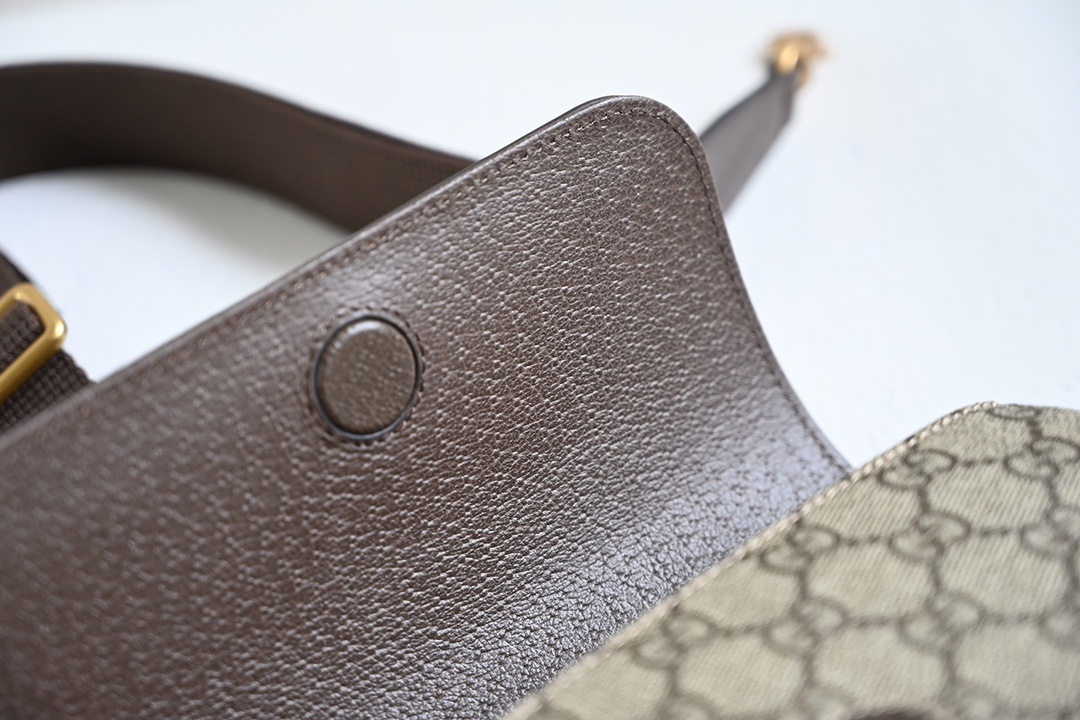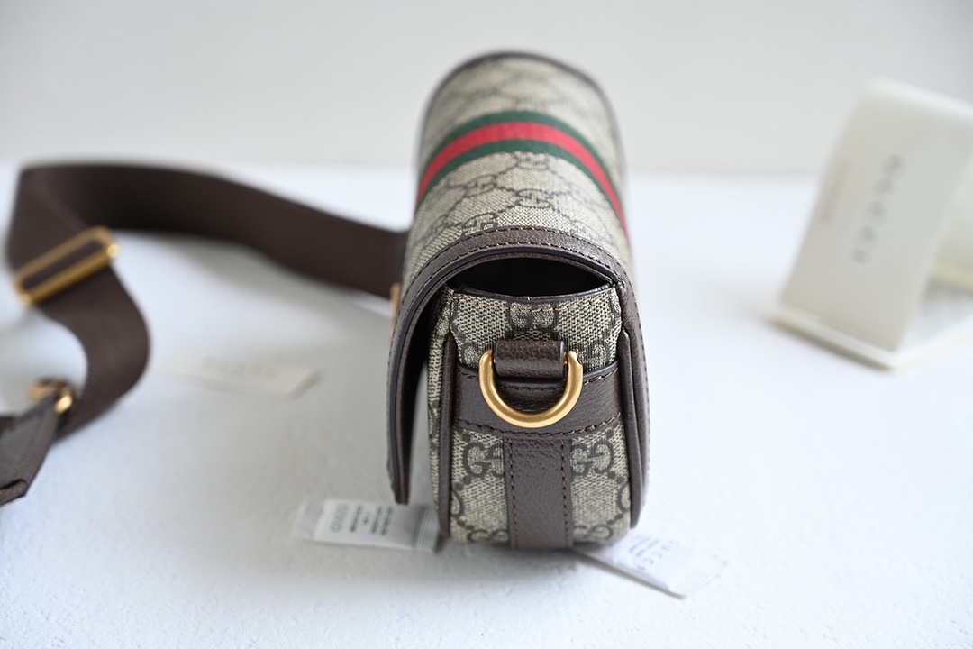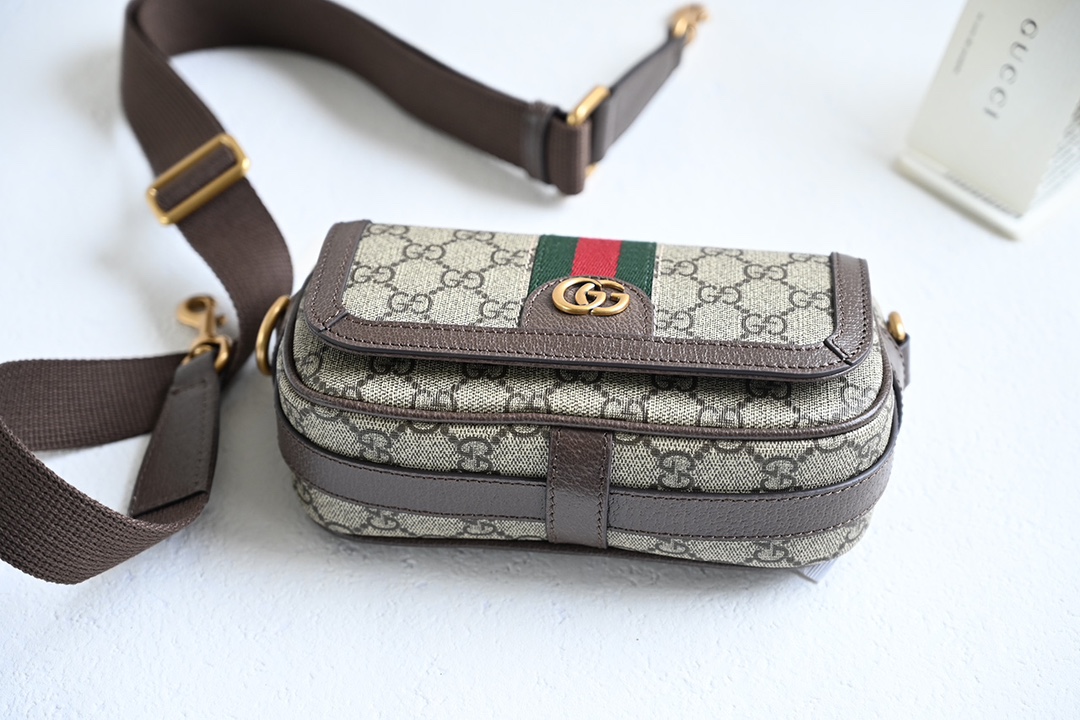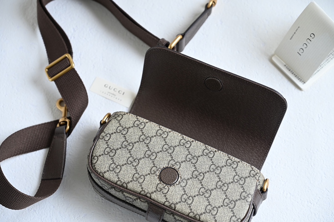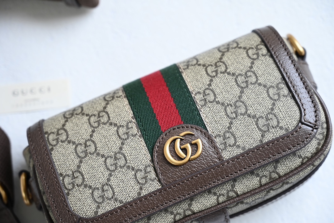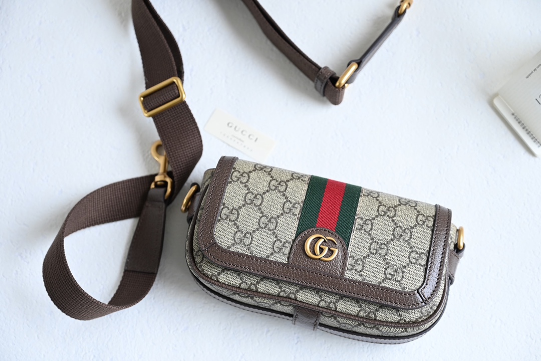 GG Ophidia series ultra-mini shoulder bag. Selected handbags such as mini crossbody bags, briefcases, and totes interpret the refreshed fashion with practical details. This Ophidia series ultra-mini bag is crafted from beige and ebony GG Supreme canvas, featuring an internal zippered pocket and adorned with double G and striped web details externally. Beige and ebony GG Supreme canvas, brown leather trim, gold-toned hardware, red and green web, cotton and linen blend lining, made in Italy.