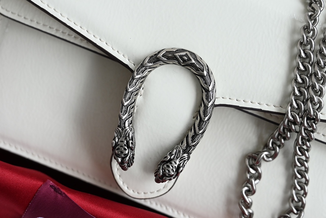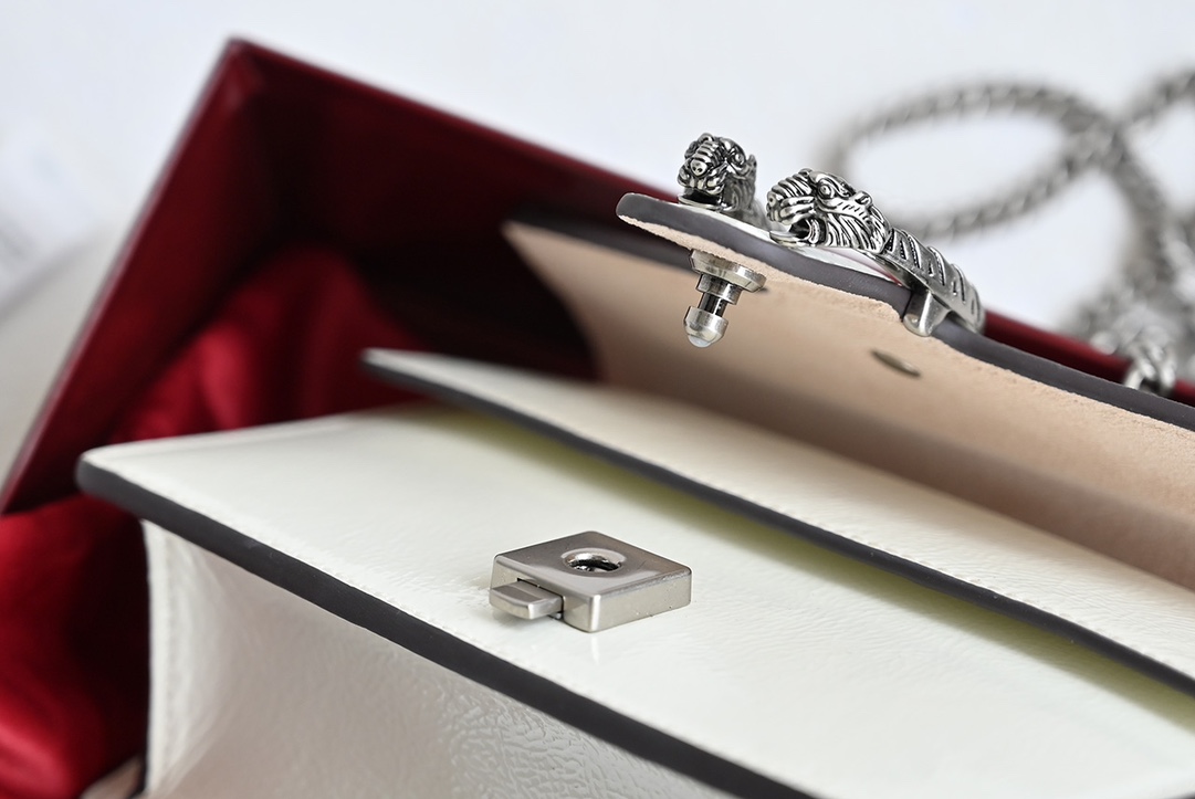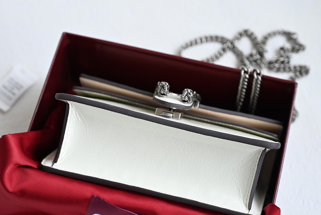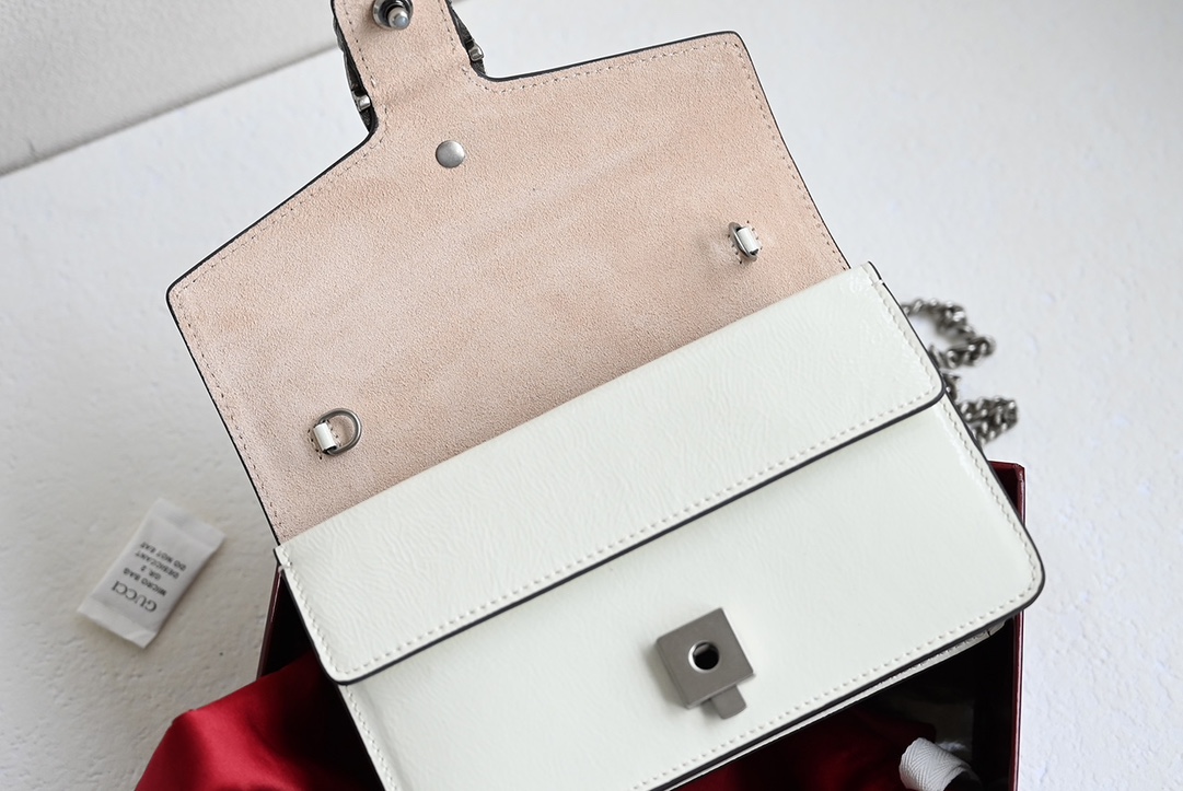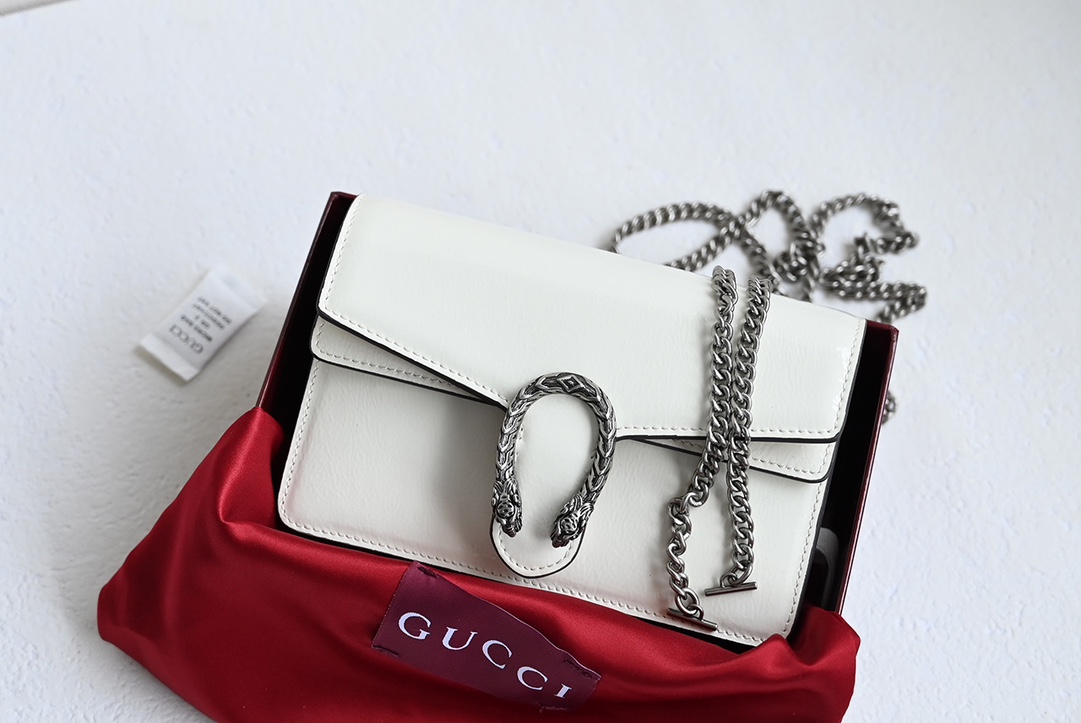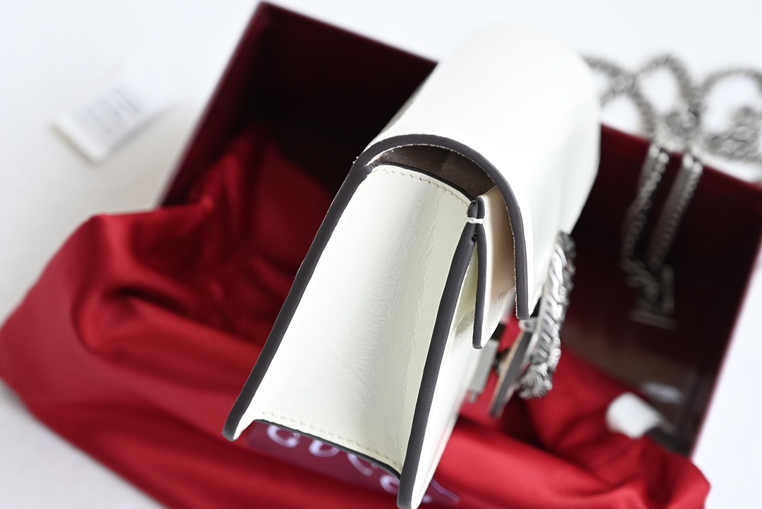 【New Arrival】Dionysus Series Super Mini Handbag. The classic Rosso Ancora black glossy patent leather material brings a fresh twist to the structured design of the Dionysus series, complementing the iconic light gold tiger head accent to highlight a contrasting aesthetic. The suede leather lining adds an elegant touch. Gucci Rosso Ancora black patent leather, light gold-toned hardware, suede lining, tiger head. Exterior: 1 front flat pocket, chain strap (53 cm drop); Length: 116 cm, push-lock closure, can be worn as a shoulder bag or crossbody bag.