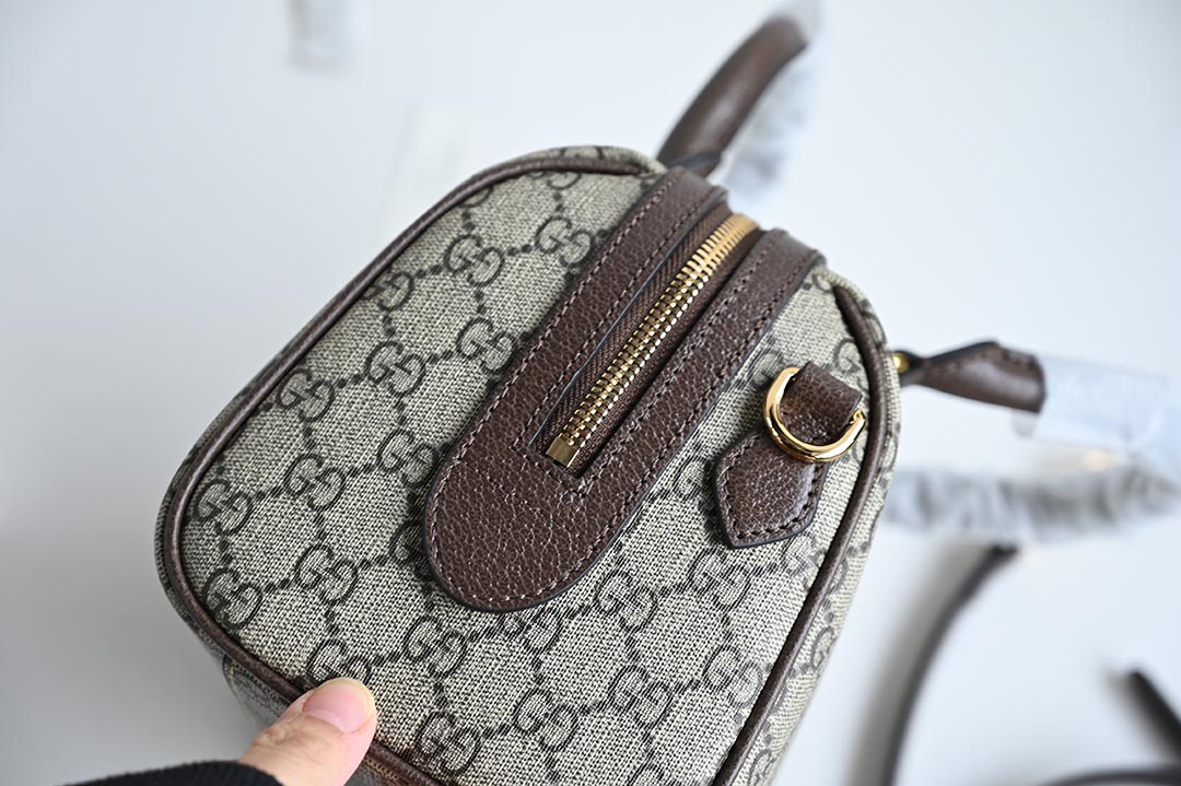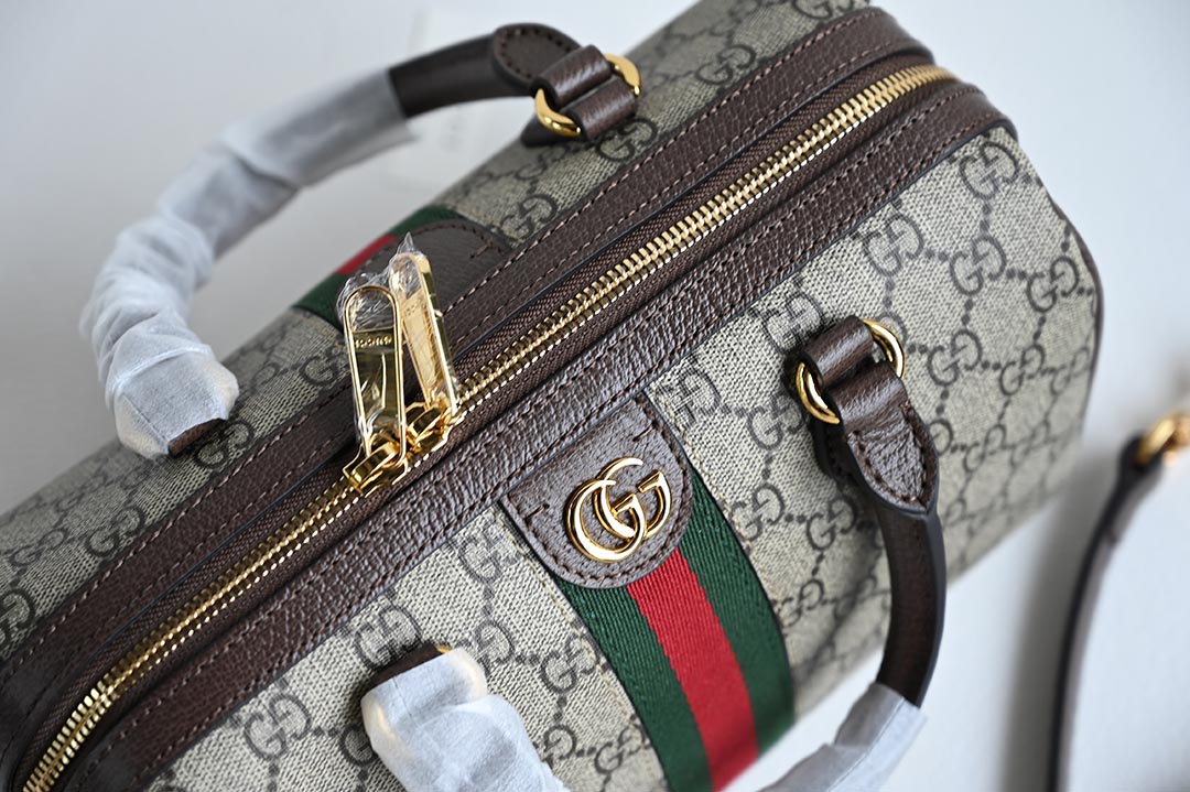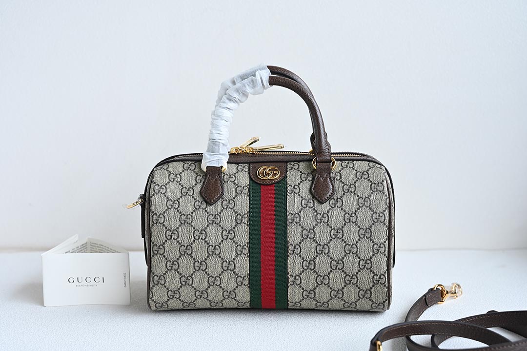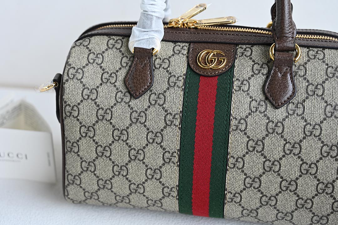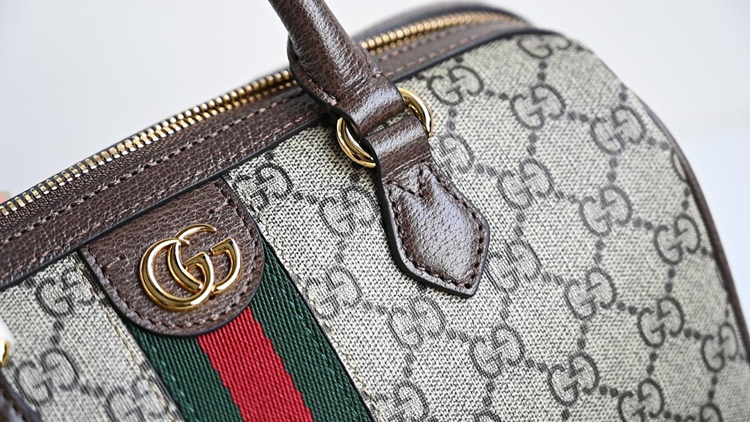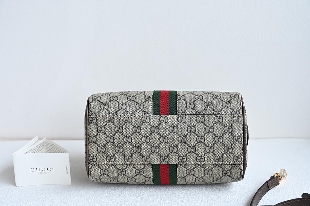 Ophidia series GG small tote bag. As a brand classic, GG Supreme canvas has become an iconic fabric in the Gucci design world. This fabric frequently appears in the brand's new collections and is reinterpreted through Gucci's aesthetic perspective. This small tote bag is fully adorned with the brand's classic interlocking pattern. The classic interlocking double G hardware adds signature charm to this piece. Beige and brown GG Supreme canvas, brown leather trim, gold-toned hardware, linen-cotton blend lining. As a selected item for Gucci Tag, this product supports NFC technology for a digital innovation experience. Double G, handle height: 10 cm, detachable shoulder strap (48 cm height), zip closure.