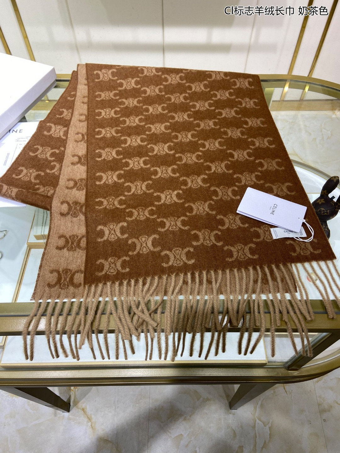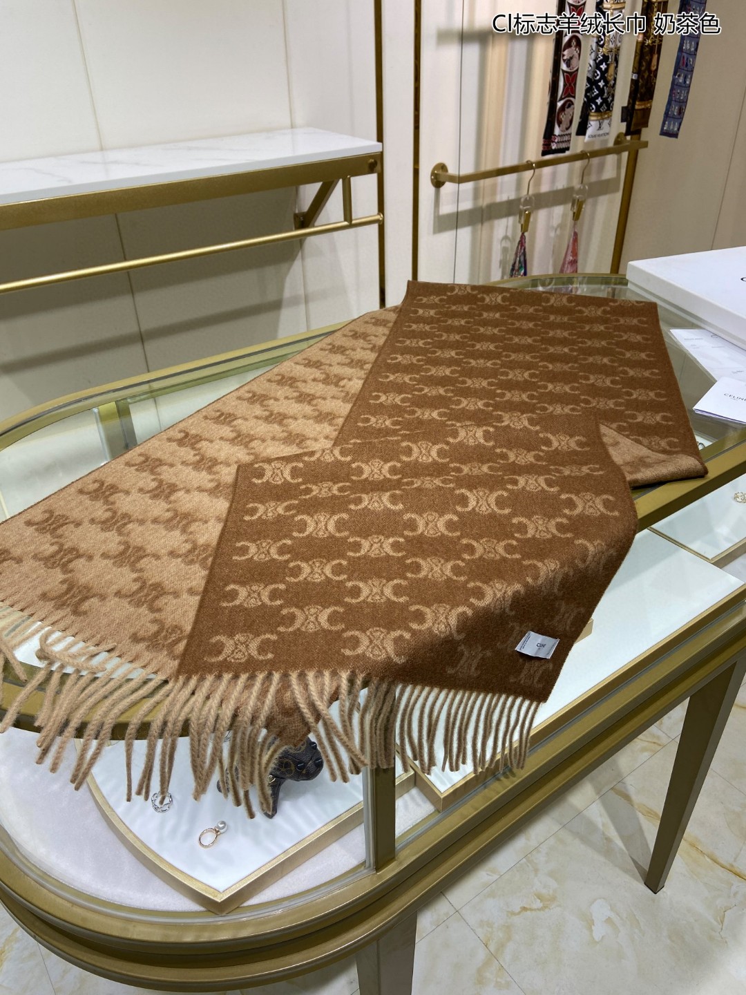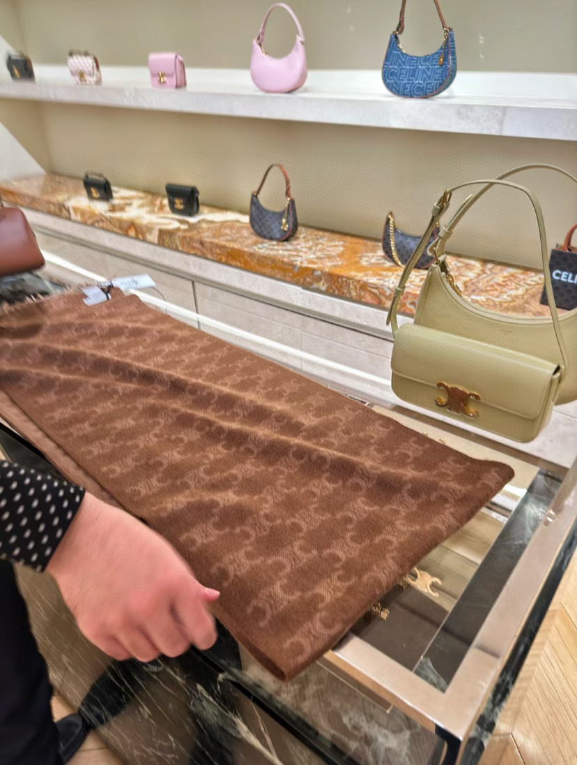 Celine's new release this year [CL Logo Cashmere Long Scarf] unisex double-sided jacquard scarf, breaking away from the previous minimalist style and adopting a retro style, truly mastering fashion trends perfectly. This export order is quite rare and also a very classical design, classic and elegant. It looks incredibly stylish when worn. The fabric uses customer-supplied cashmere material, with a heavy feel, specifications 38*180. This length can be worn as a shawl or wrapped, suitable for both formal and casual outfits.