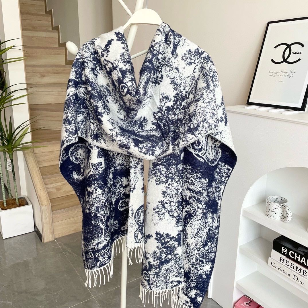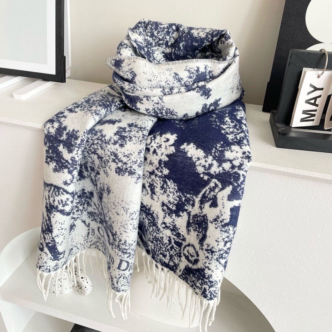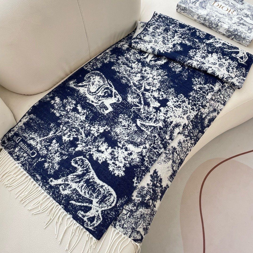 Original title: The Sauvage Jouy printed scarf reinterprets Dior's classic pattern. Meticulously crafted from a blend of cashmere and wool, it features fringe detailing and the Christian Dior logo. Designed with a long silhouette, it can be tied around the neck or draped over the shoulders.