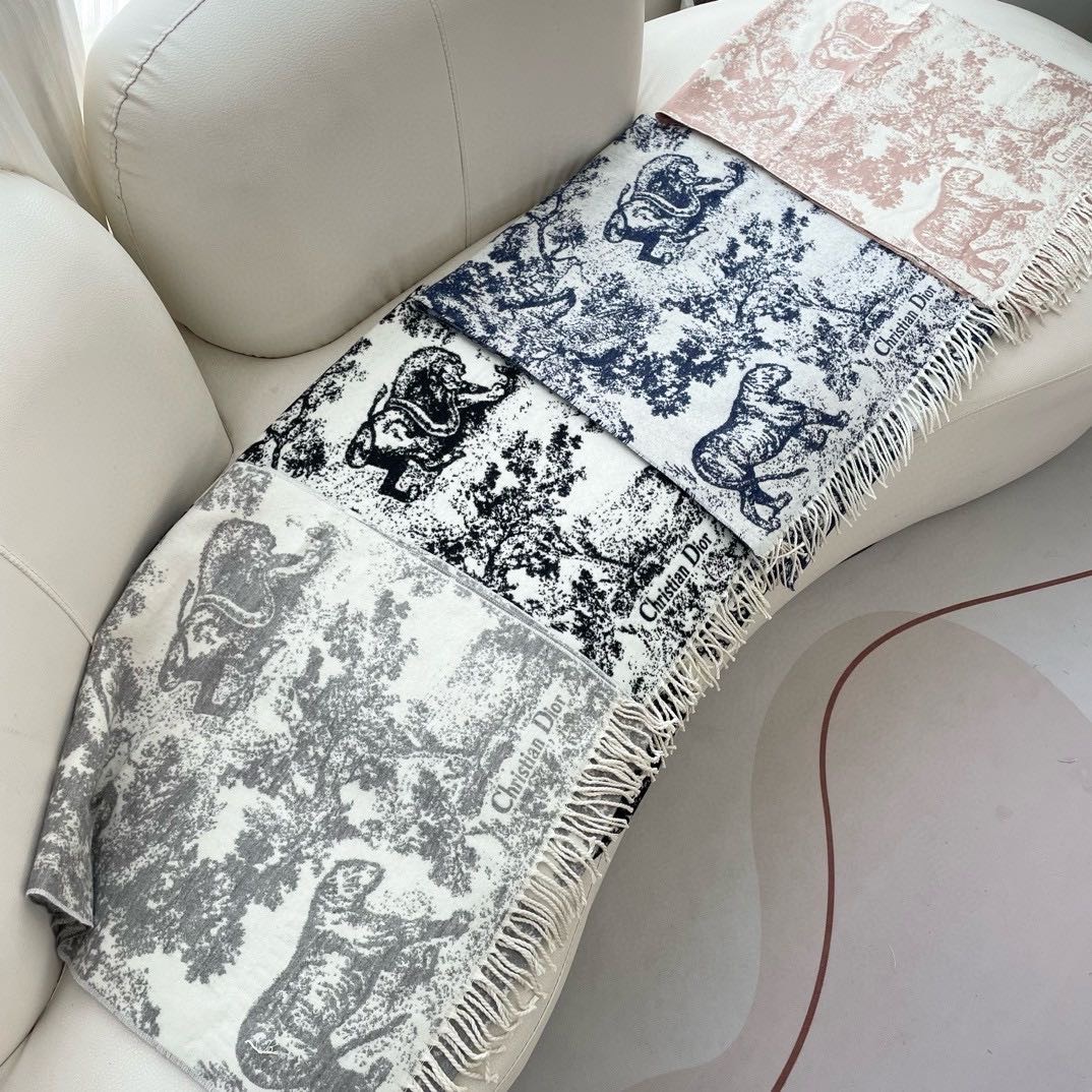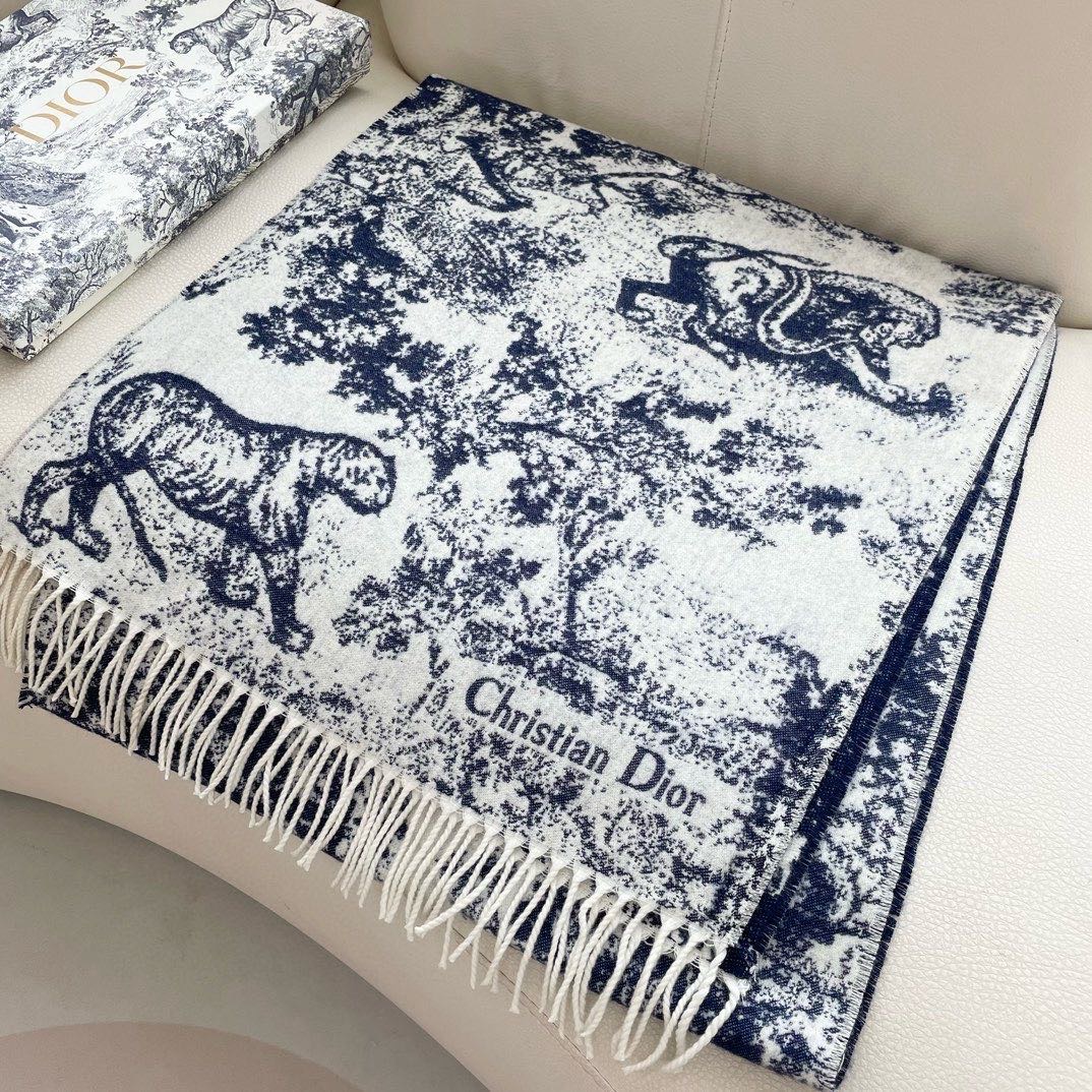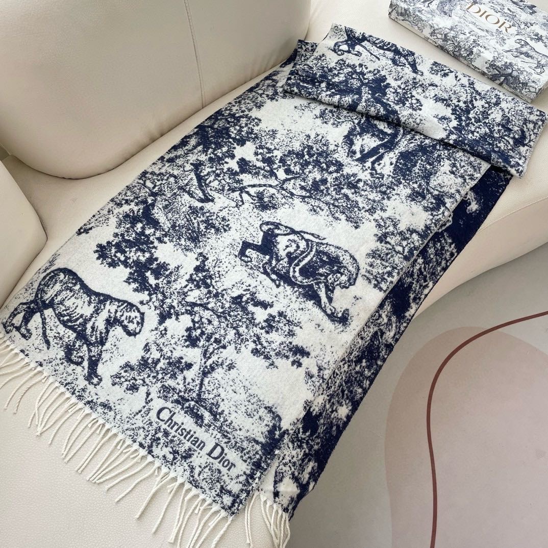 Original title: The Sauvage Jouy printed scarf reinterprets Dior's classic pattern. Meticulously crafted from a blend of cashmere and wool, it features fringe detailing and the Christian Dior logo. Designed with a long silhouette, it can be tied around the neck or draped over the shoulders.