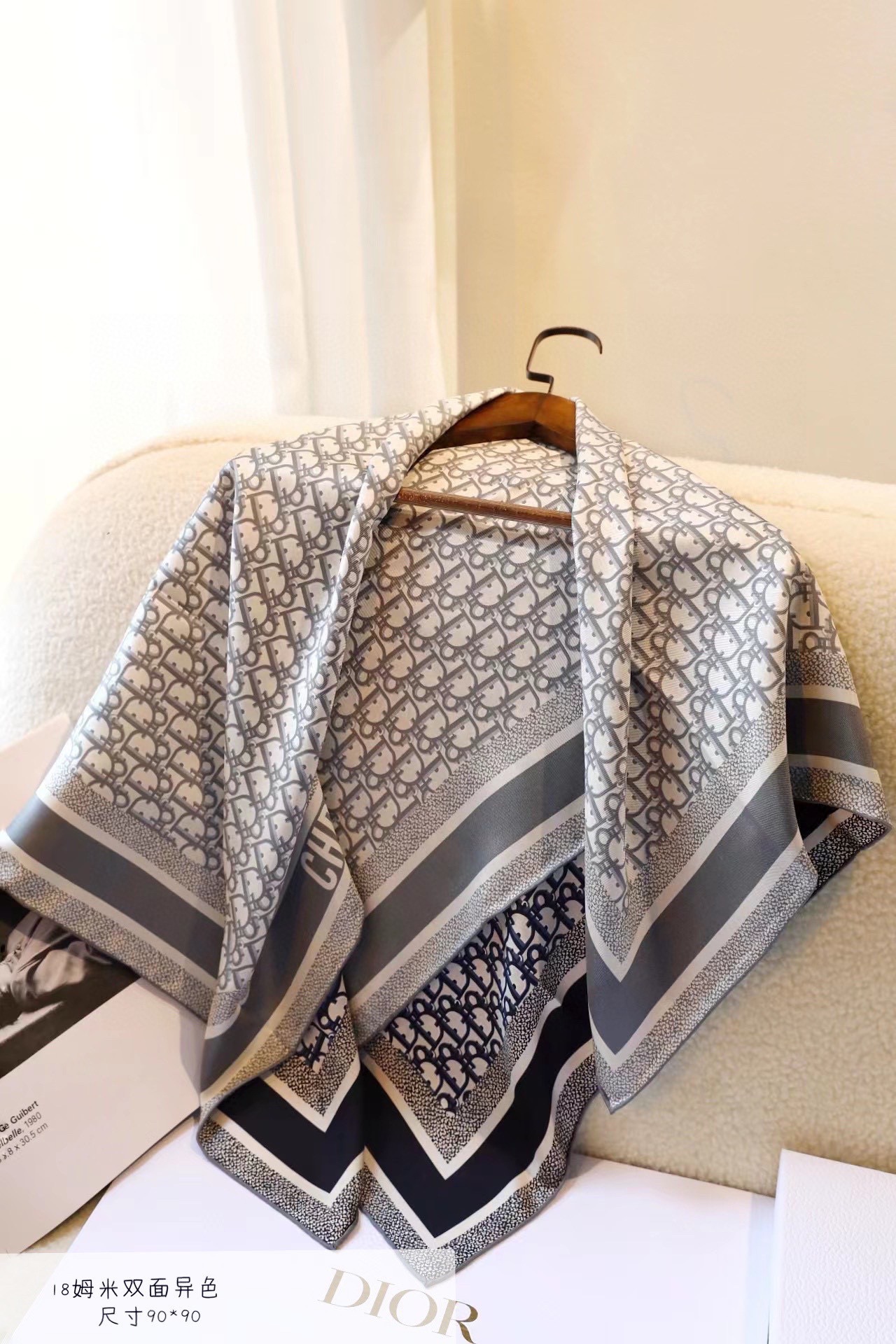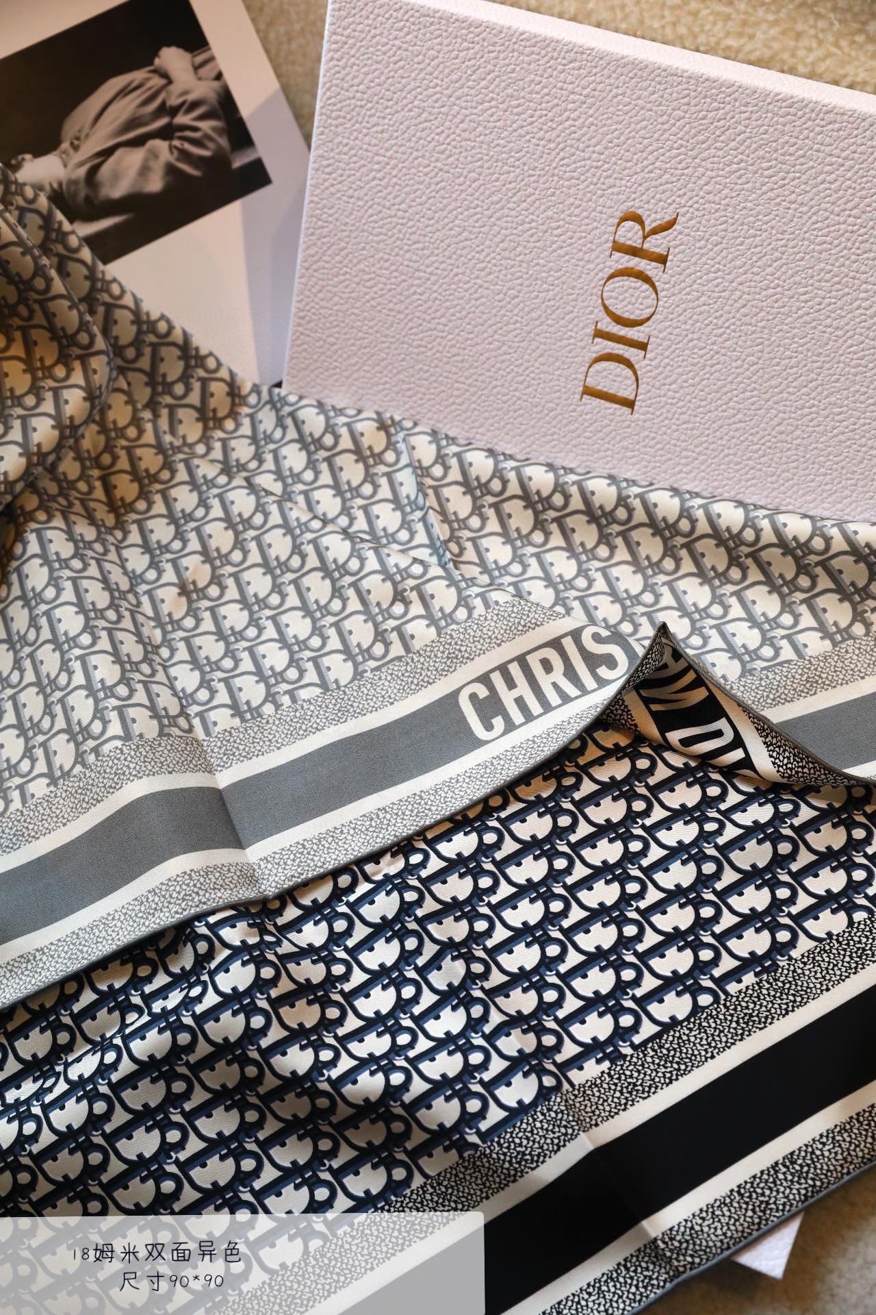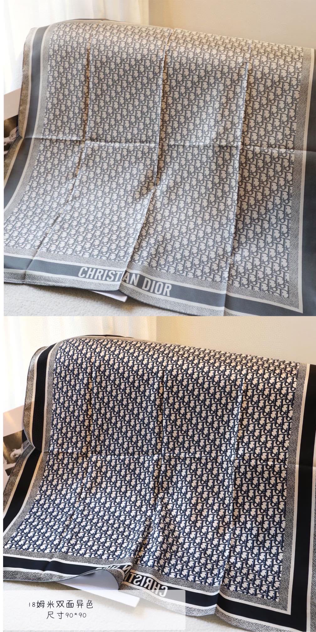 New arrival This 18-momme Dio**win [90 features a dual-color double-sided design] pays tribute to the iconic Oblique print. Meticulously crafted from mulberry silk twill fabric, it features hand-rolled edges, with one side in rose pink and the other in gray, both adorned with a tonal "CHRISTIAN DIOR" logo jacquard stripe pattern. It can be tied around the neck or worn as a headscarf to create a stylish Di**-inspired look.