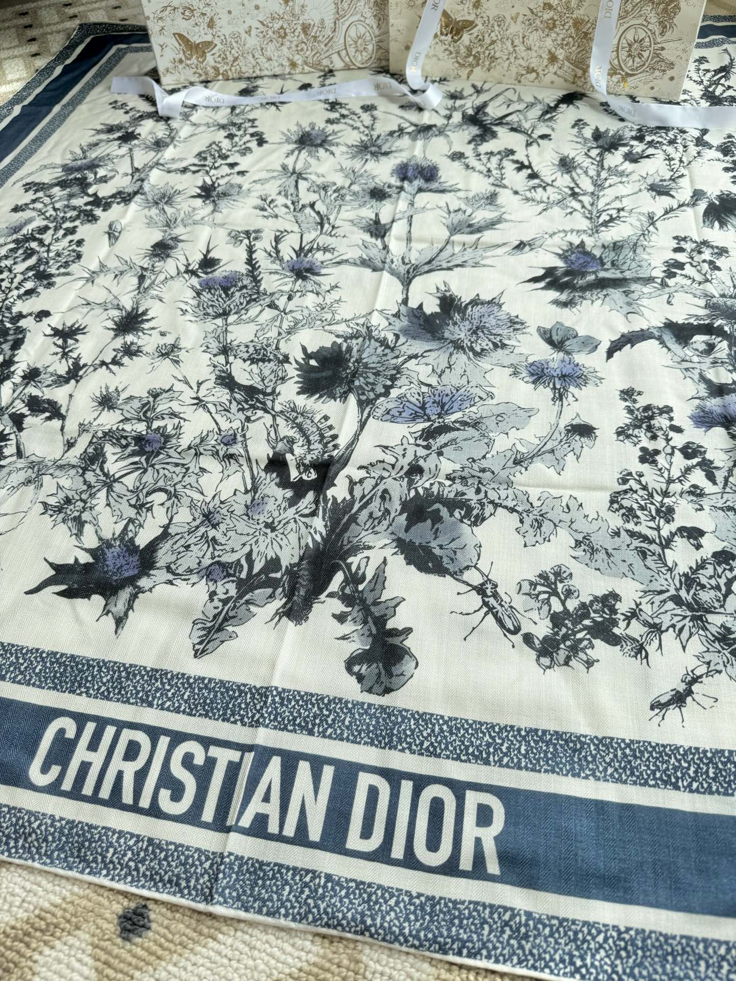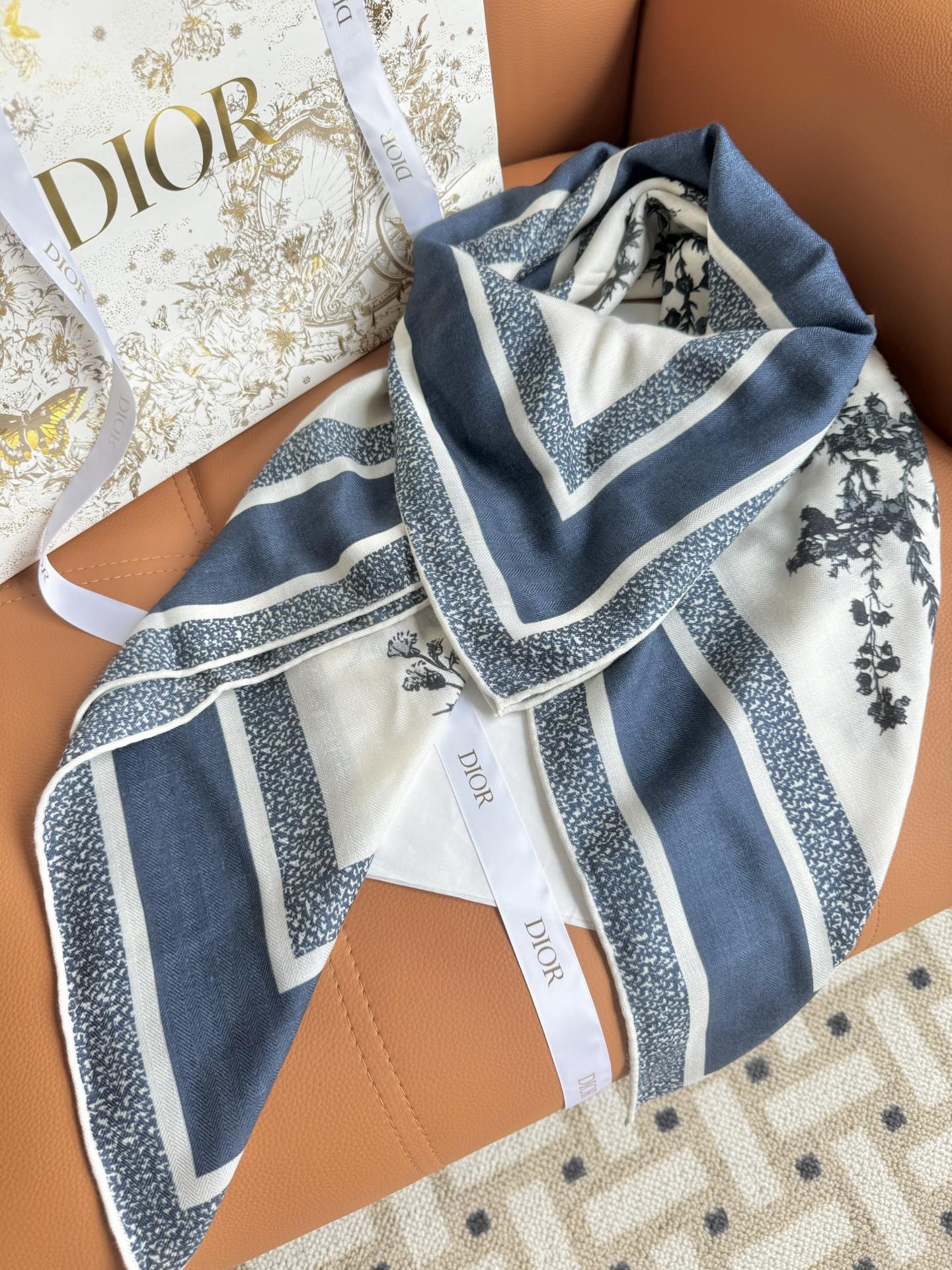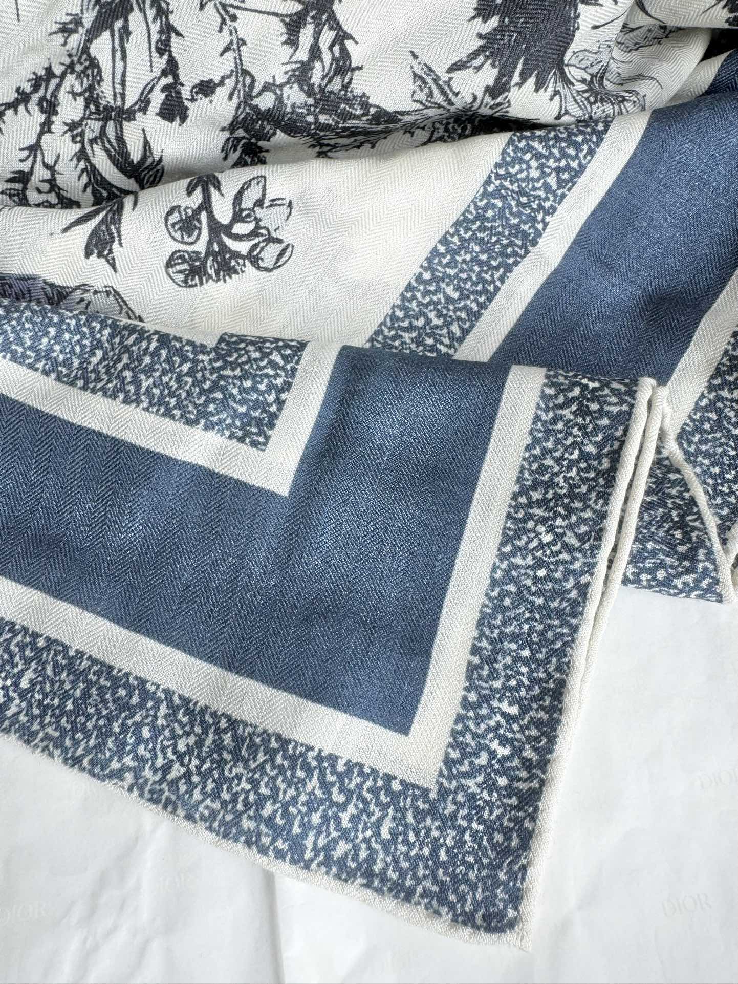This square scarf is from the limited edition collection, adorned with the Palms toile de Jouy print designed by Pietro Ruffo, depicting a lush jungle inhabited by diverse wildlife, paying tribute to the beauty of nature. Meticulously crafted from white and navy blue silk-wool fabric, it features a double-sided design with hand-rolled edges, accented with the Christian D logo to enhance the style. It can be tied around the neck or worn as a headscarf to create a classic D look.