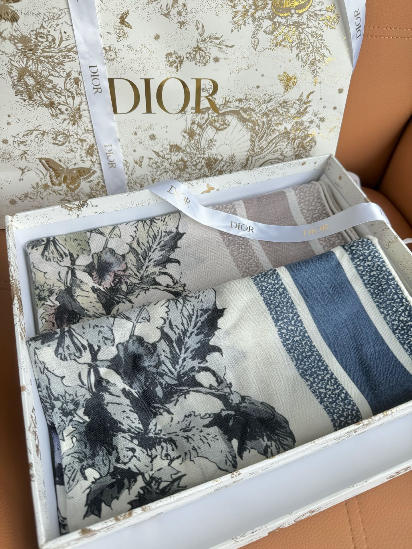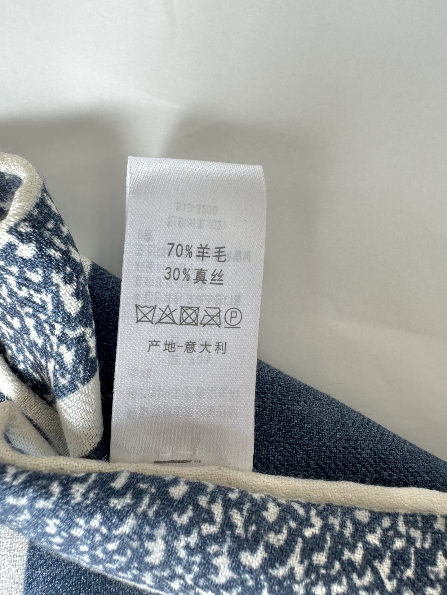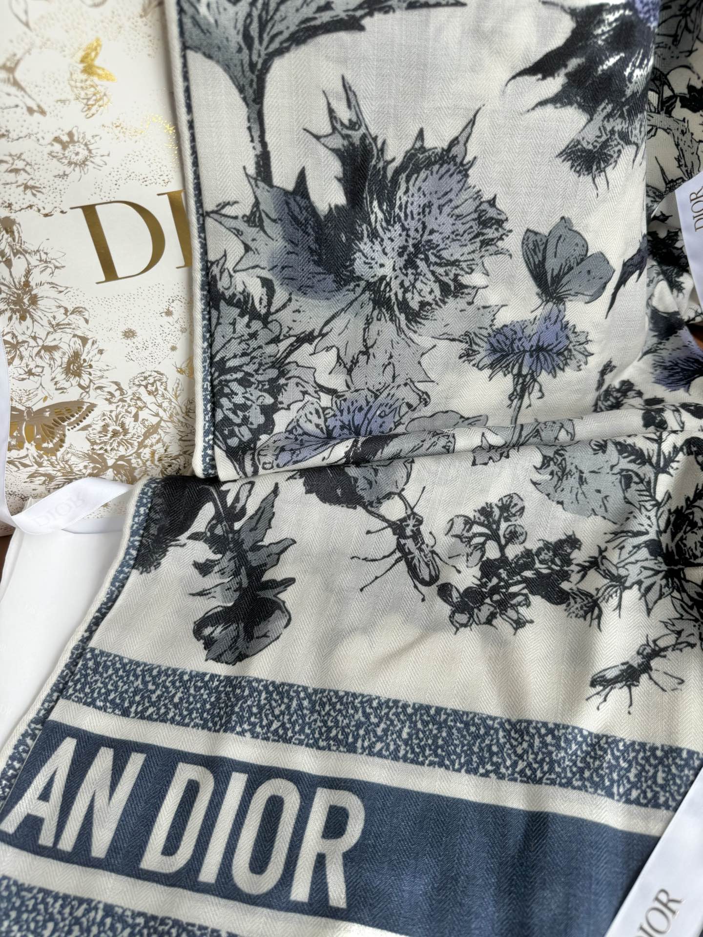 This square scarf is from the limited edition collection, adorned with the Palms toile de Jouy print designed by Pietro Ruffo, depicting a lush jungle inhabited by diverse wildlife, paying tribute to the beauty of nature. Meticulously crafted from white and navy blue silk-wool fabric, it features a double-sided design with hand-rolled edges, accented with the Christian D logo to enhance the style. It can be tied around the neck or worn as a headscarf to create a classic D look.