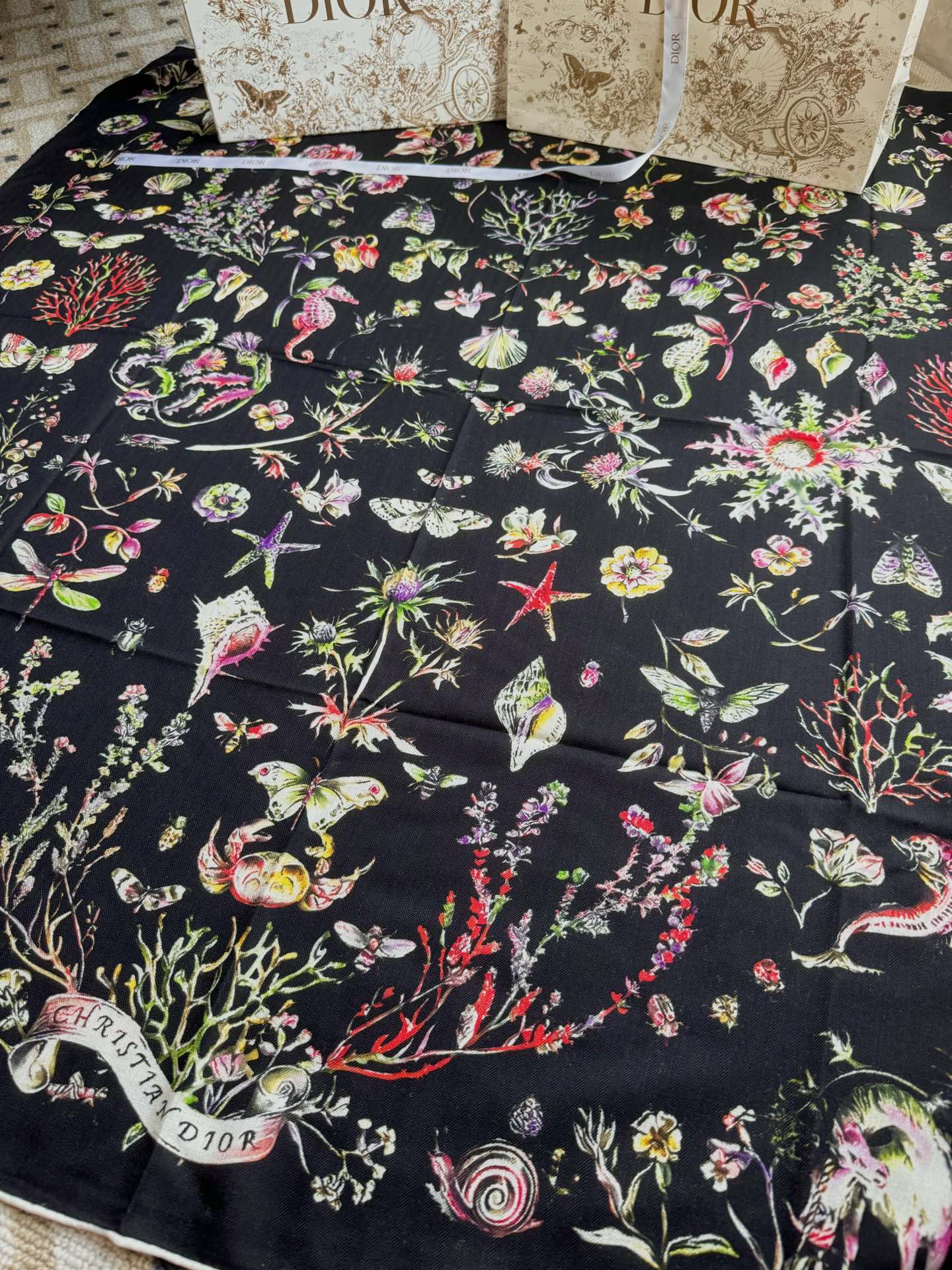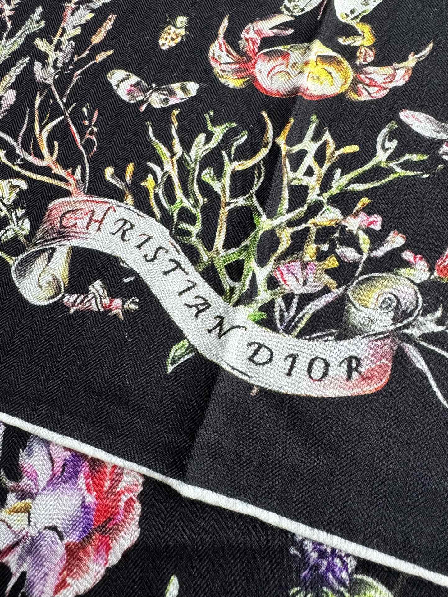 This scarf features a Dior Cabinet de Curiosites pattern print designed by Pietro Ruffo, showcasing various animals in a floral design. Meticulously crafted from ivory and pink mulberry silk twill fabric, adorned with a multi-color pattern, hand-rolled edges, and embellished with the Christian Dior logo. Can be tied around the neck or worn as a headscarf to create a fashionable classic look.