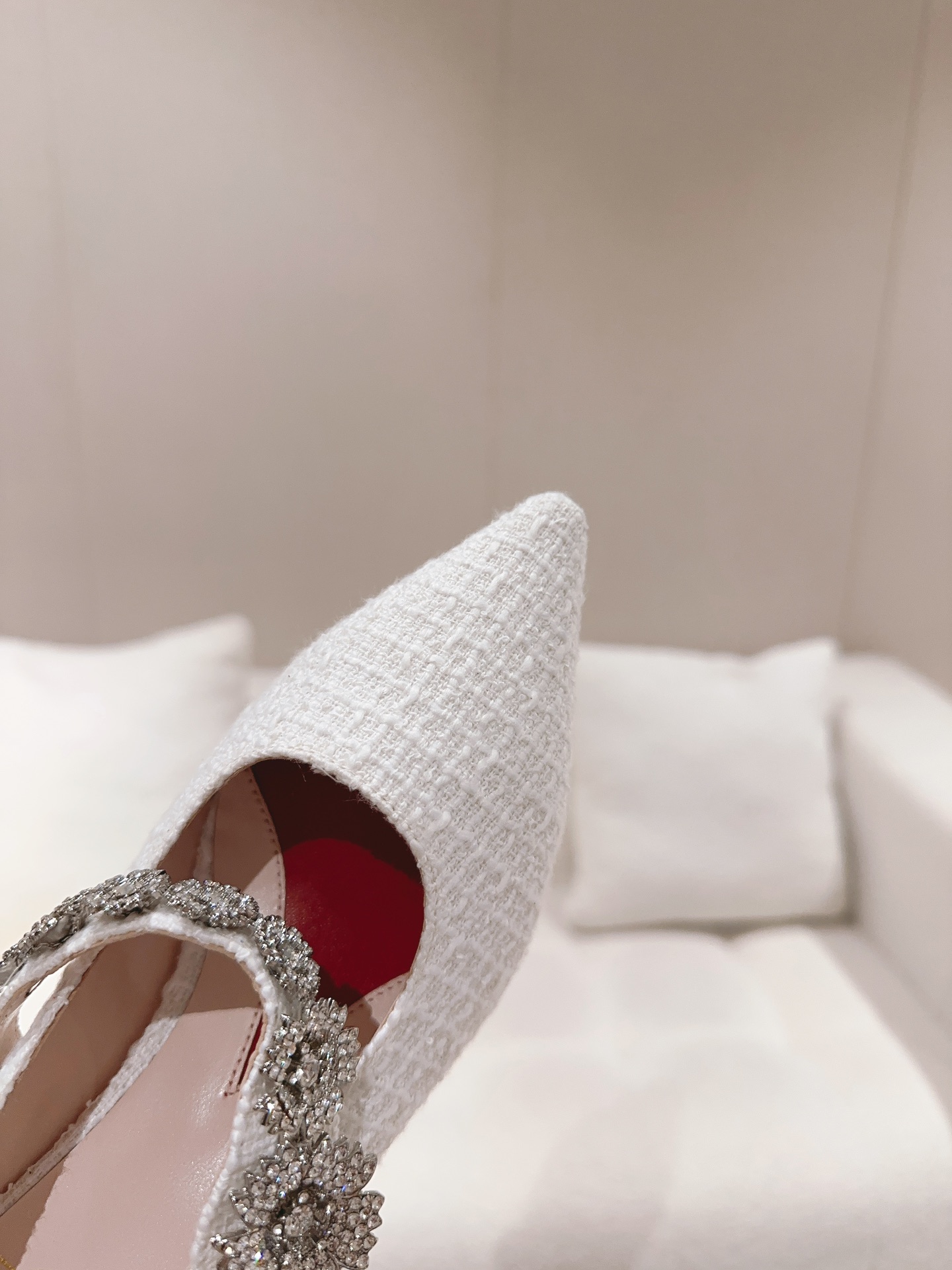 ◽ Upper: Original custom silk upper paired with original mold-customized Swarovski flash crystal buckle