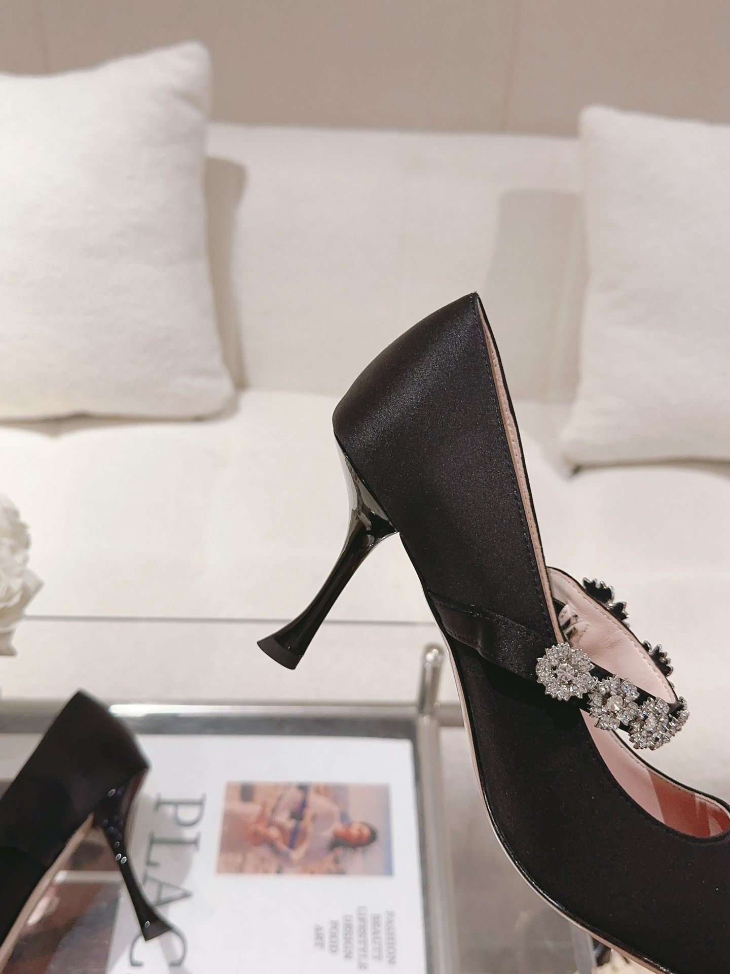 ◽ Upper: Original customized silk surface paired with original molded customized Swarovski crystal buckle