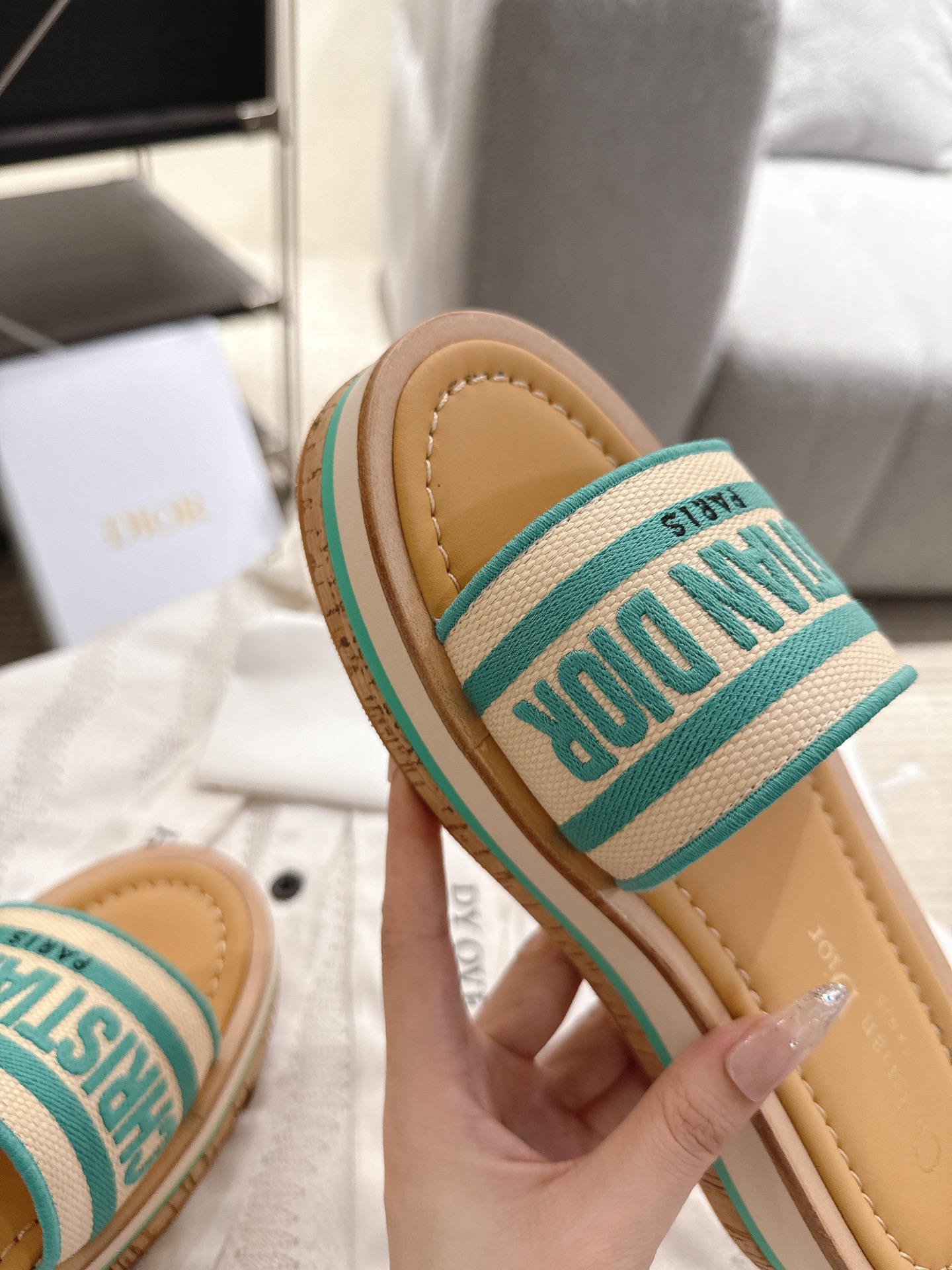 ✔️ This Dway platform sandal is fashionable and casual. The dark blue/black/gray cotton style is adorned with a recognizable Christian Dior Paris emblem embroidery. Paired with a lightweight perforated material platform sole decorated with blue and white stripes, it can elevate the style of various outfits this season.