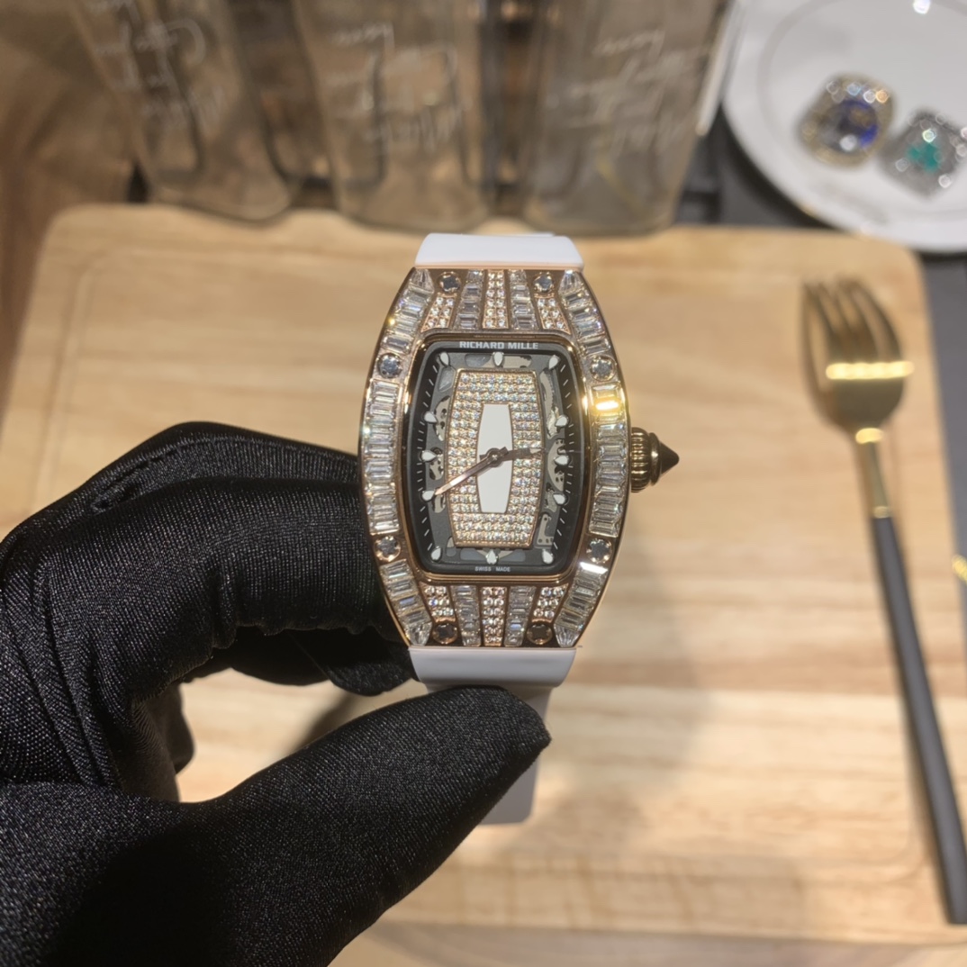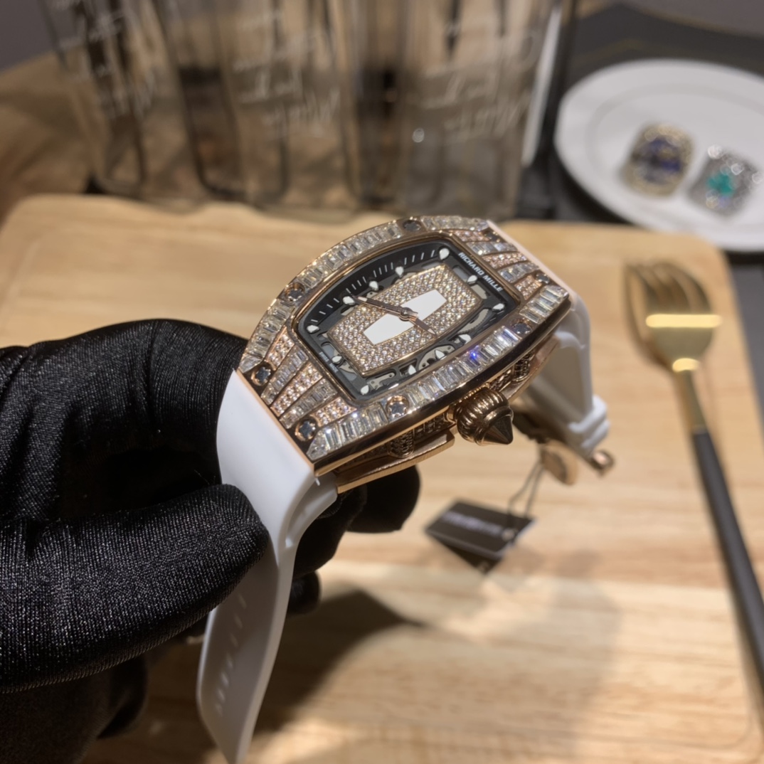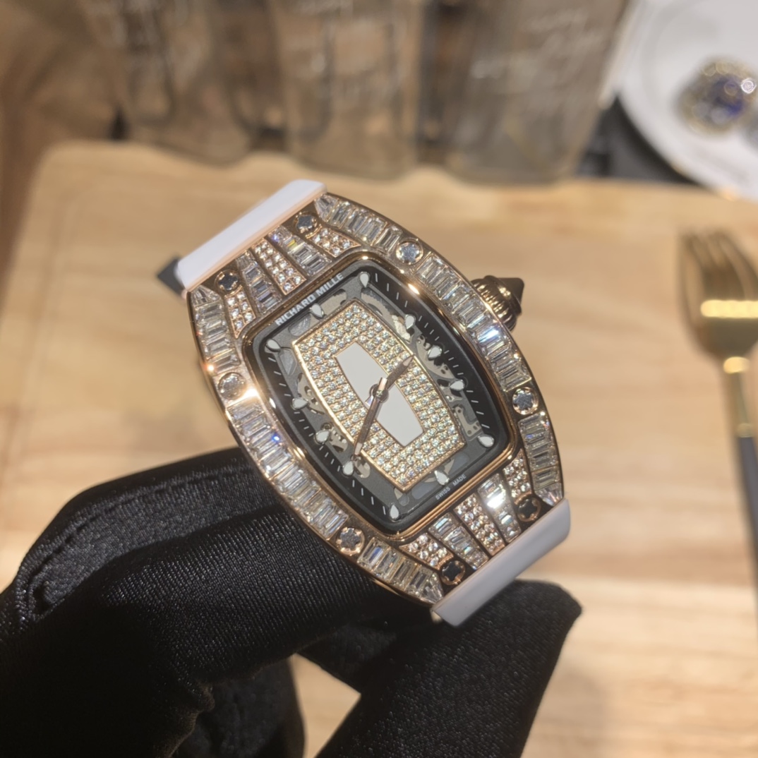 Richard Mille RM007-1 "Diamond Crown" watch for women. Features diamonds, 45x31mm case, automatic movement, titanium with black PVD. Combines artistry and technical innovation for bold women.