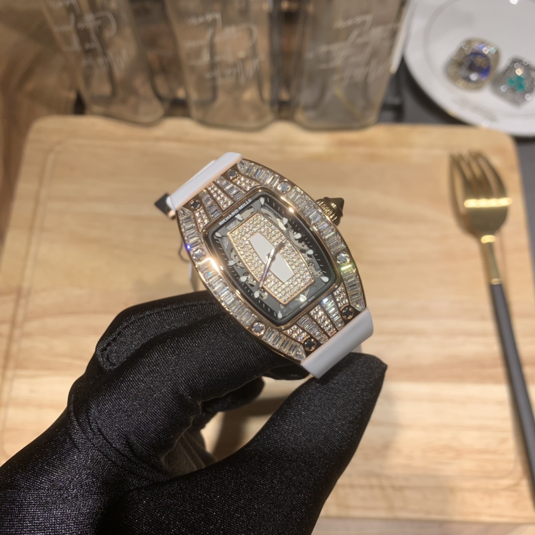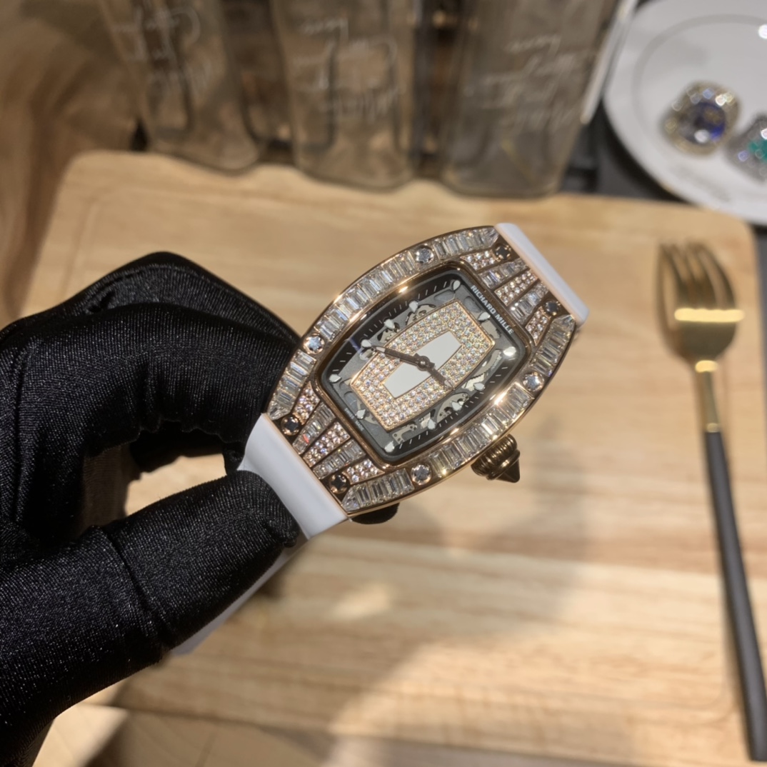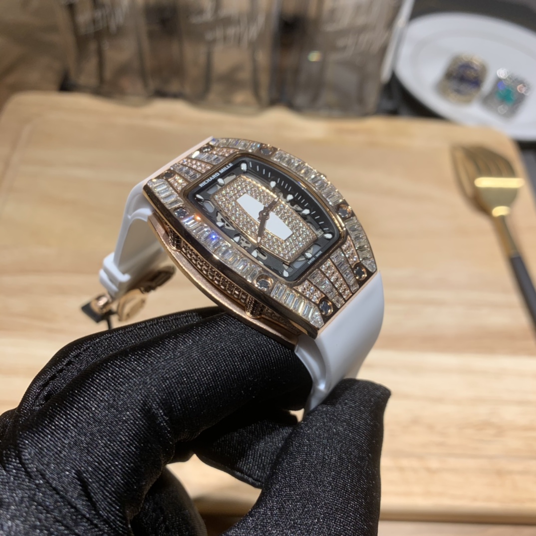 Richard Mille RM007-1 "Diamond Crown" watch for women. Features diamonds, 45x31mm case, automatic movement, titanium with black PVD. Combines artistry and technical innovation for bold women.