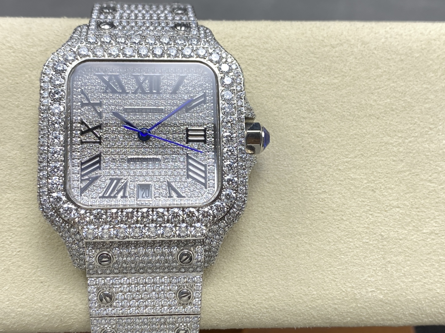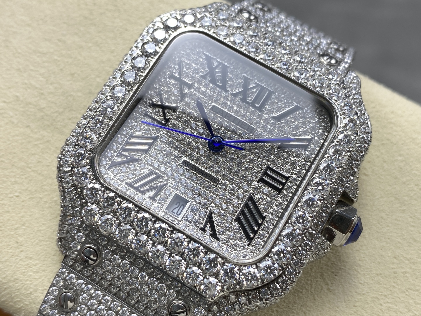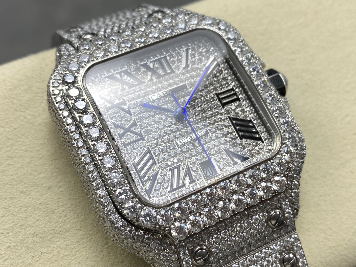 Beautiful genuine diamond Cartier Santos. Custom designs with various diamonds. Hand-set, tested, automatic movement, 904L steel. Fast customization. Timeless classic.