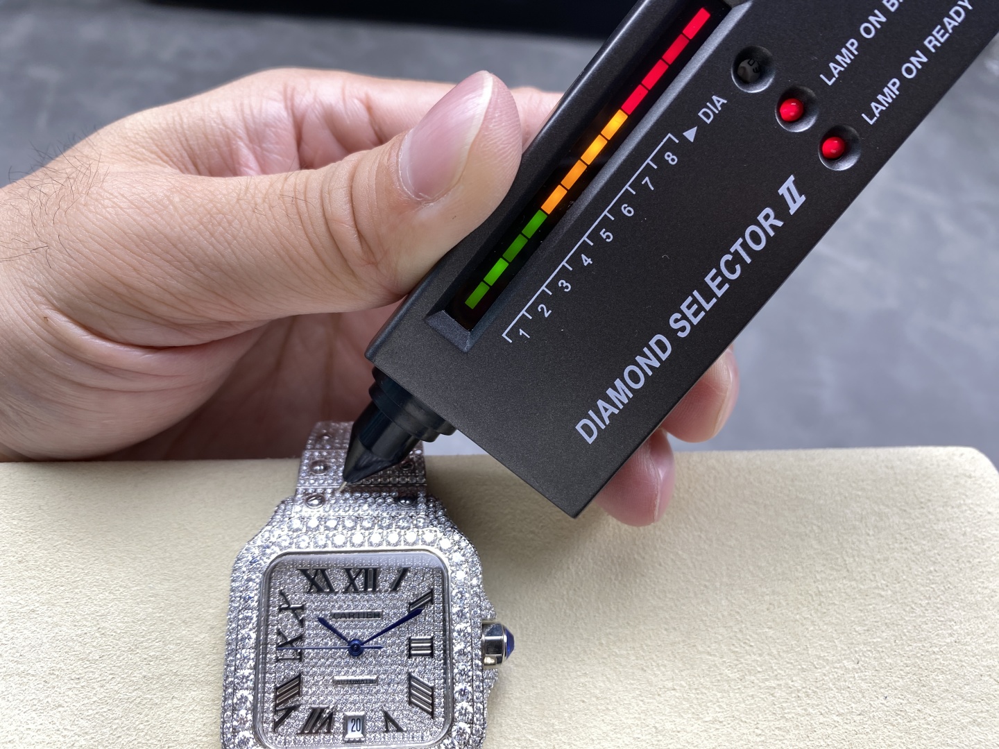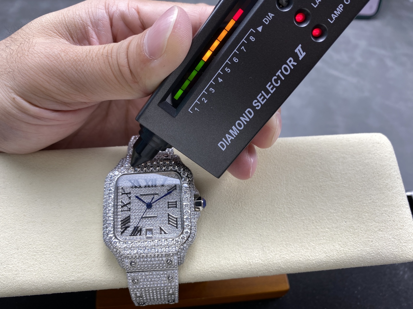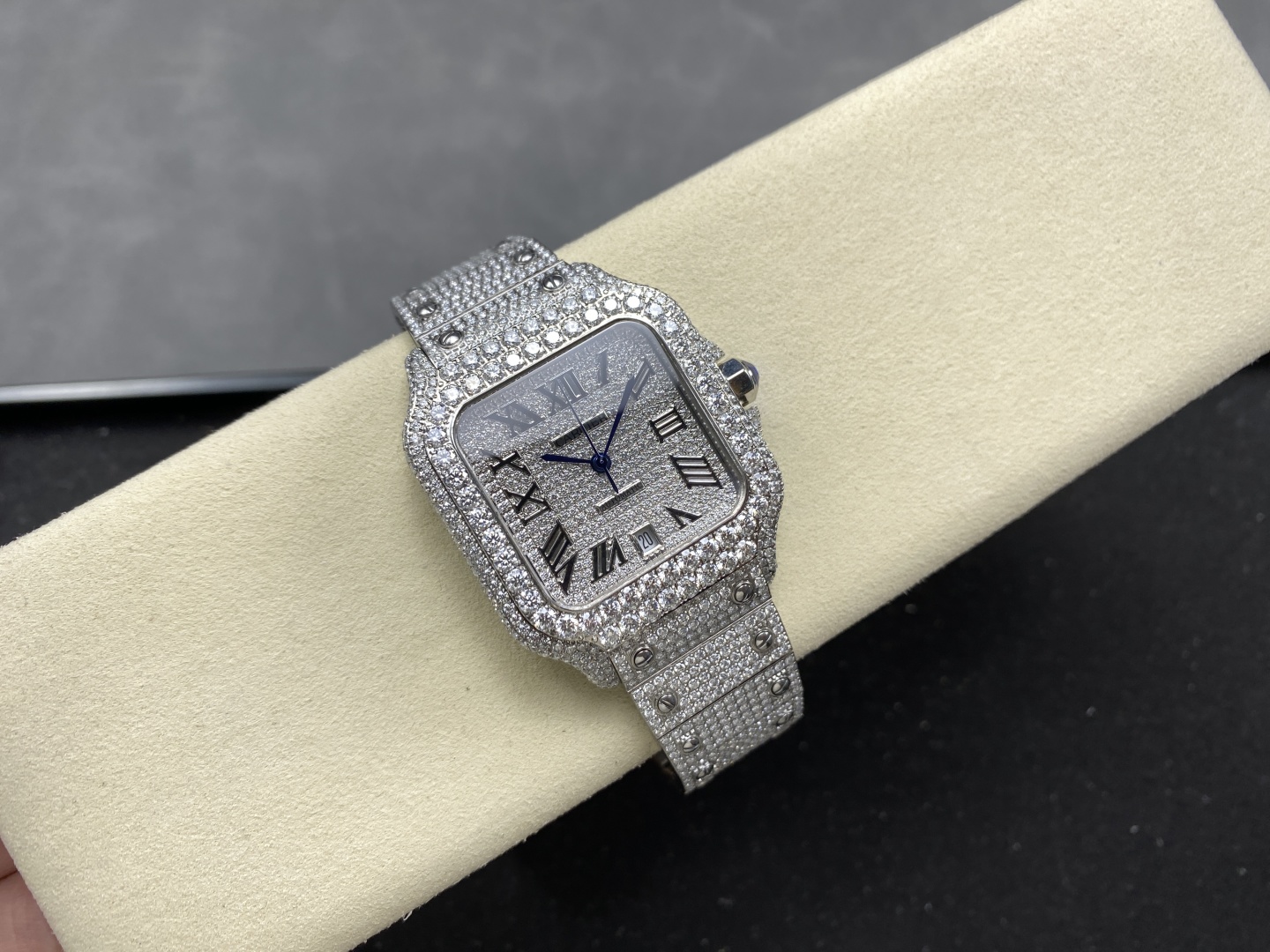 Beautiful genuine diamond Cartier Santos. Custom designs with various diamonds. Hand-set, tested, automatic movement, 904L steel. Fast customization. Timeless classic.