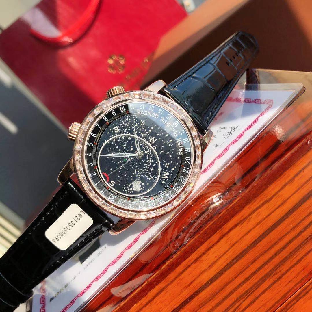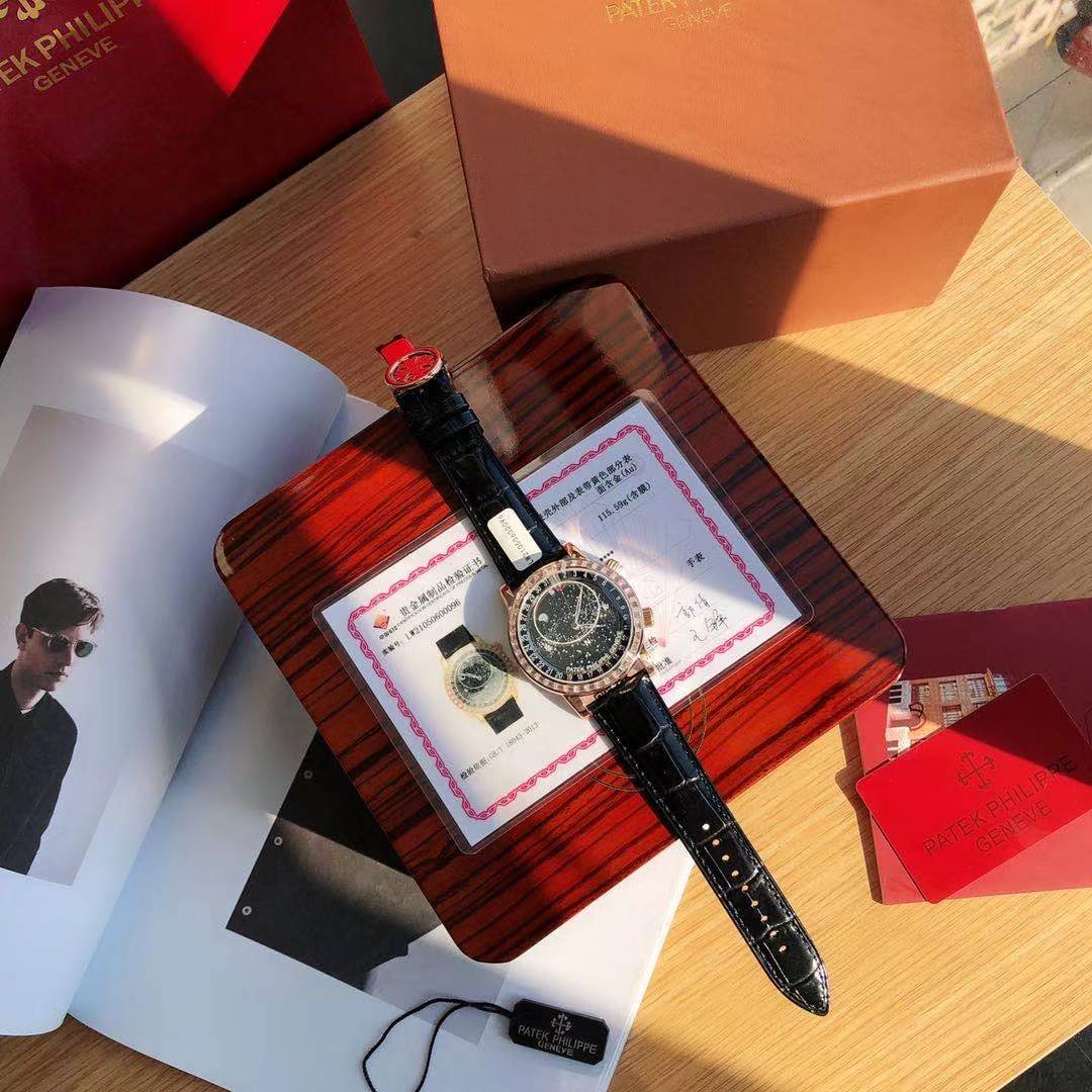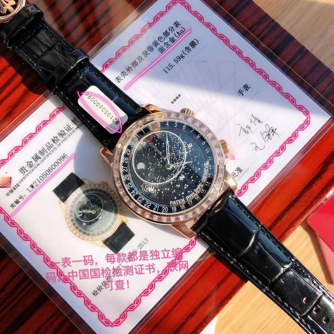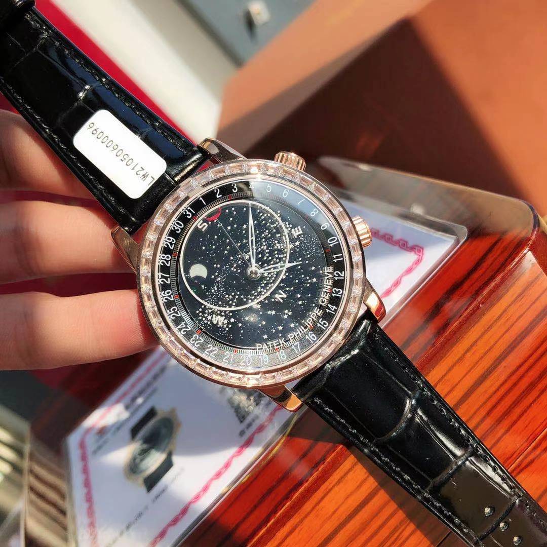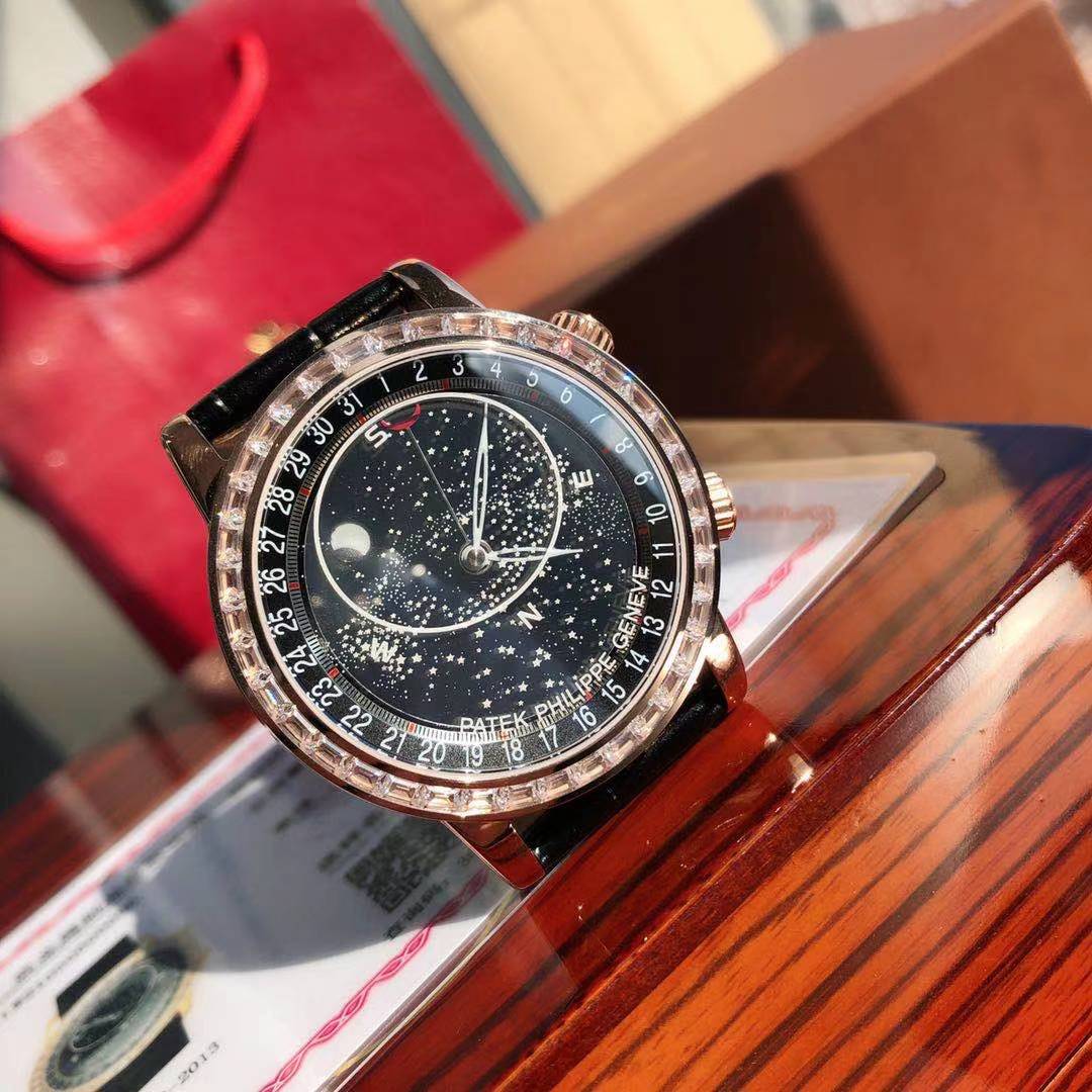 Patek Philippe Celestial Geneva Sky 6104G. Features star chart, blue dial, golden moon phase, automatic movement. 18k gold case, GTC certificate. Advanced glass, sapphire gems. Top replica.