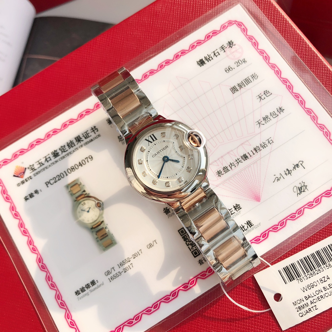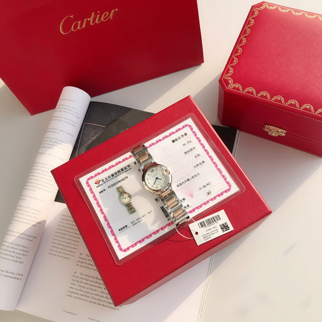 Genuine 18K gold plated Cartier Ballon Bleu with real diamonds. Quartz movement, 28mm dial, 11 VS1.2 diamonds. Certified, authentic, perfect for gifts.