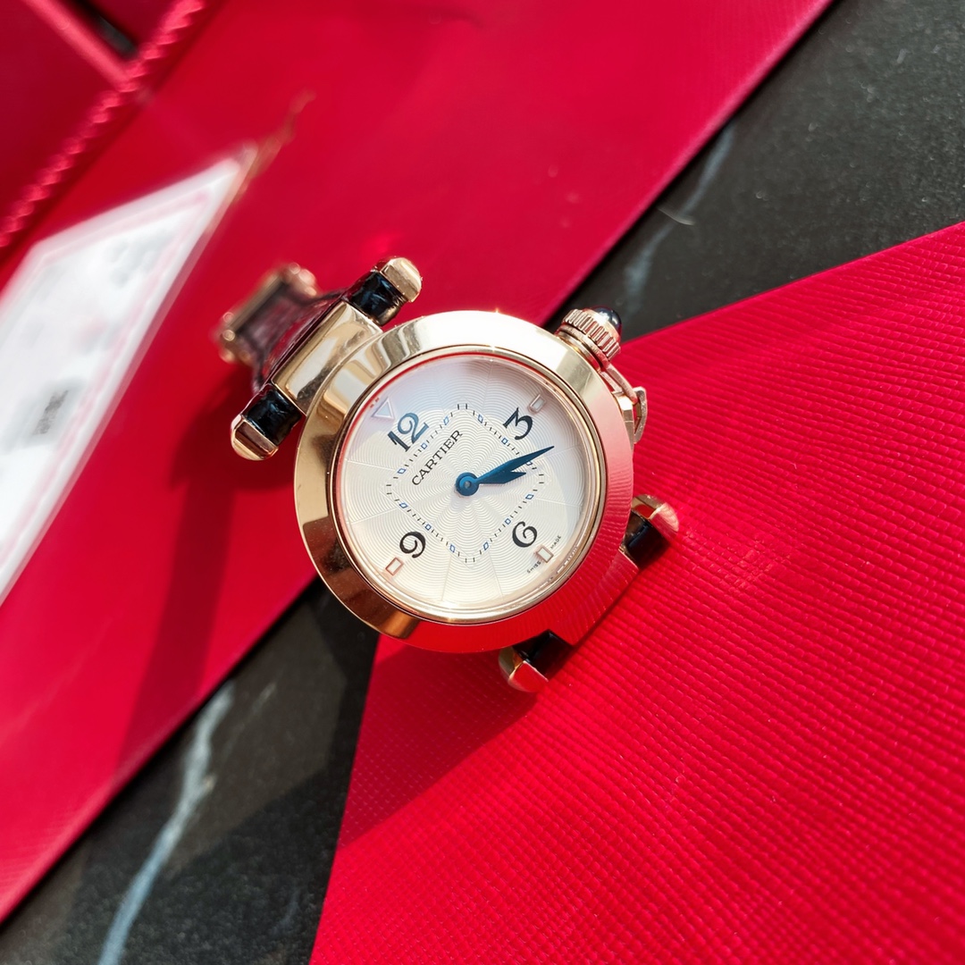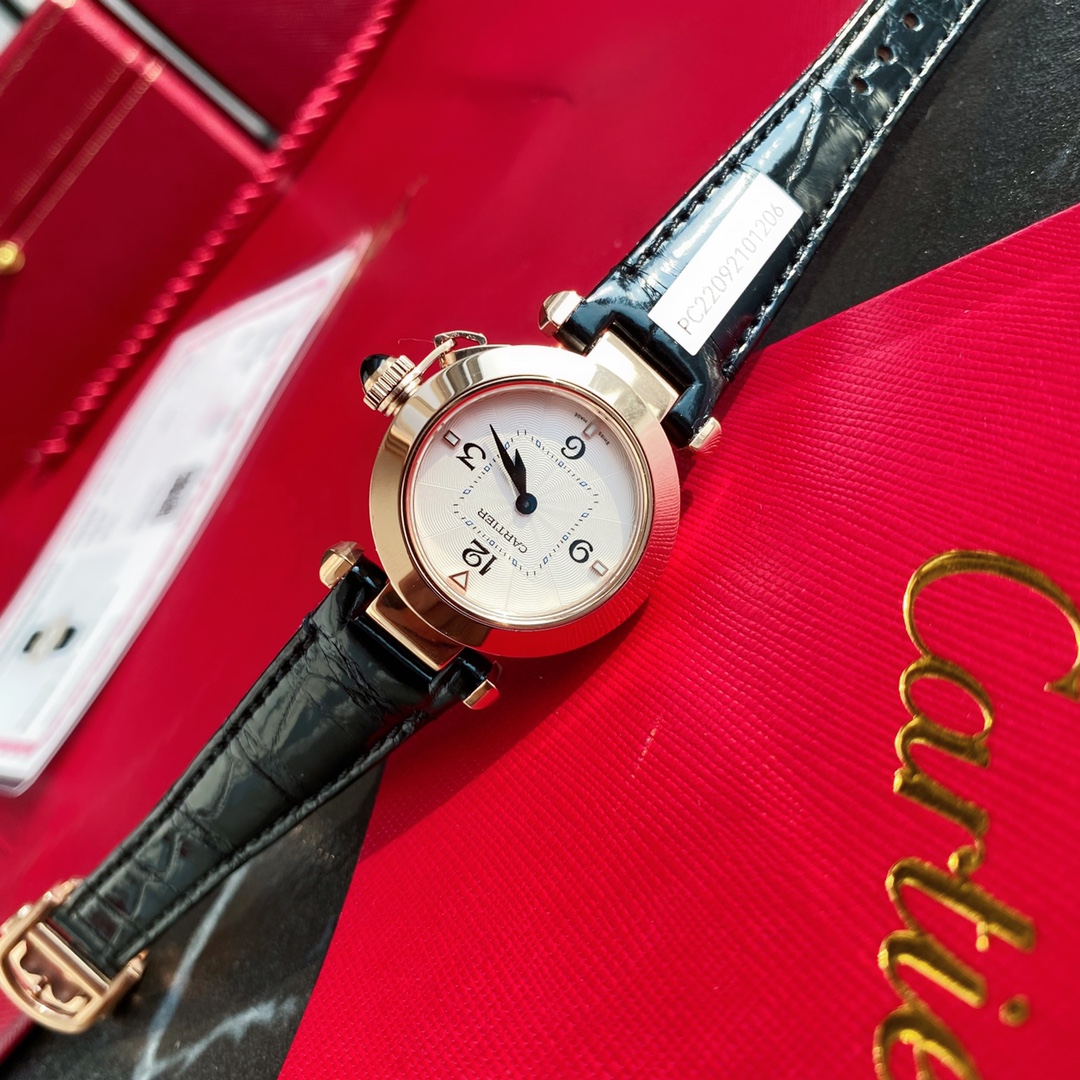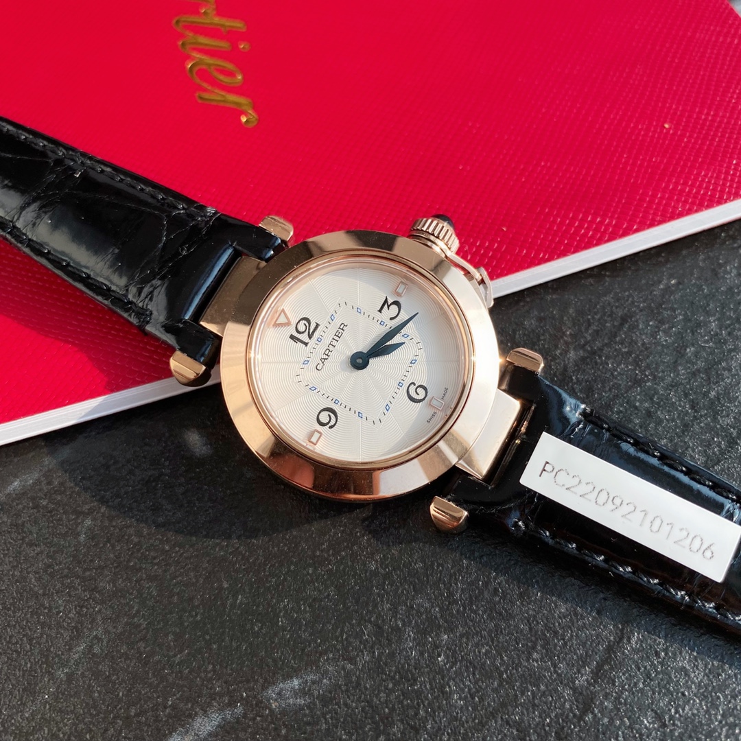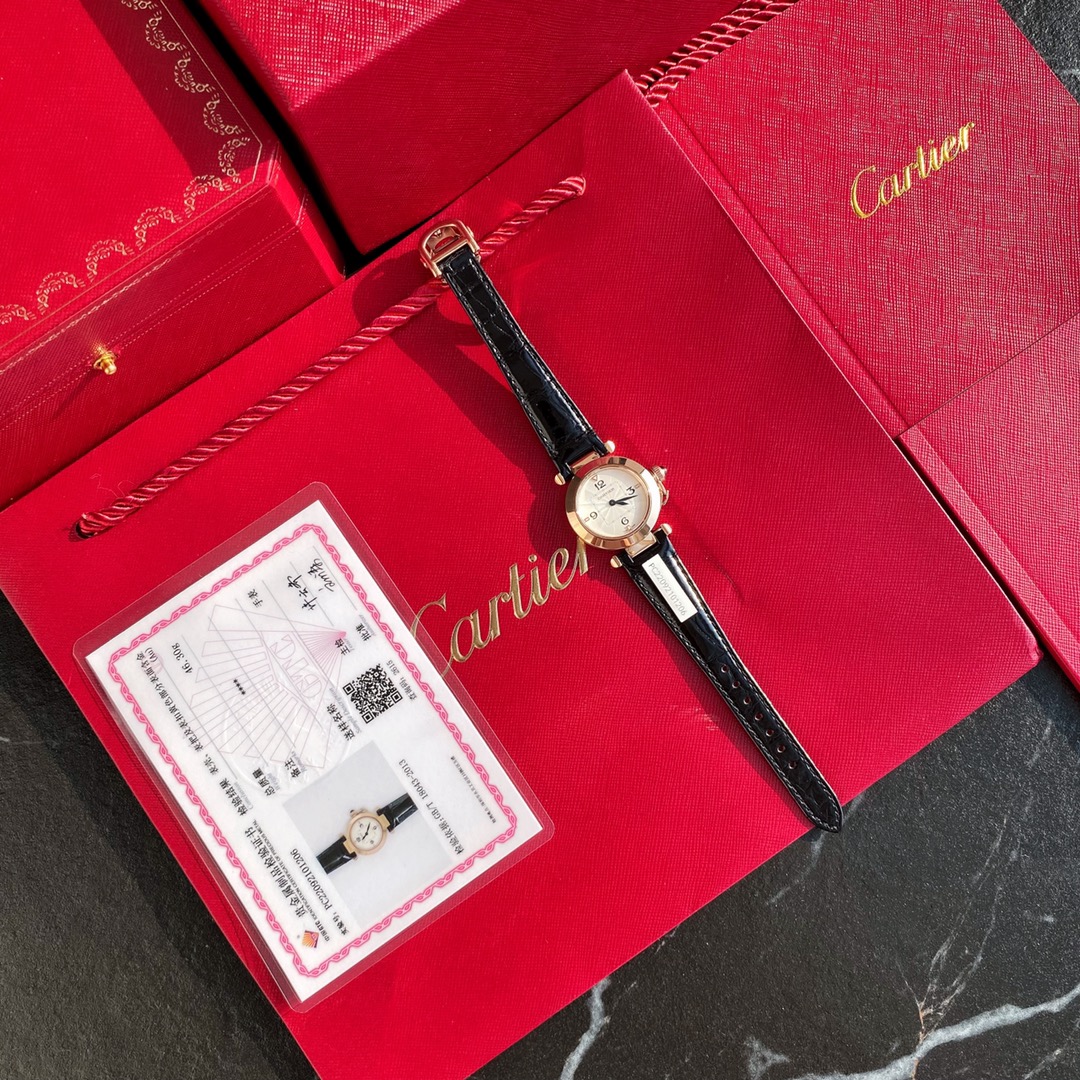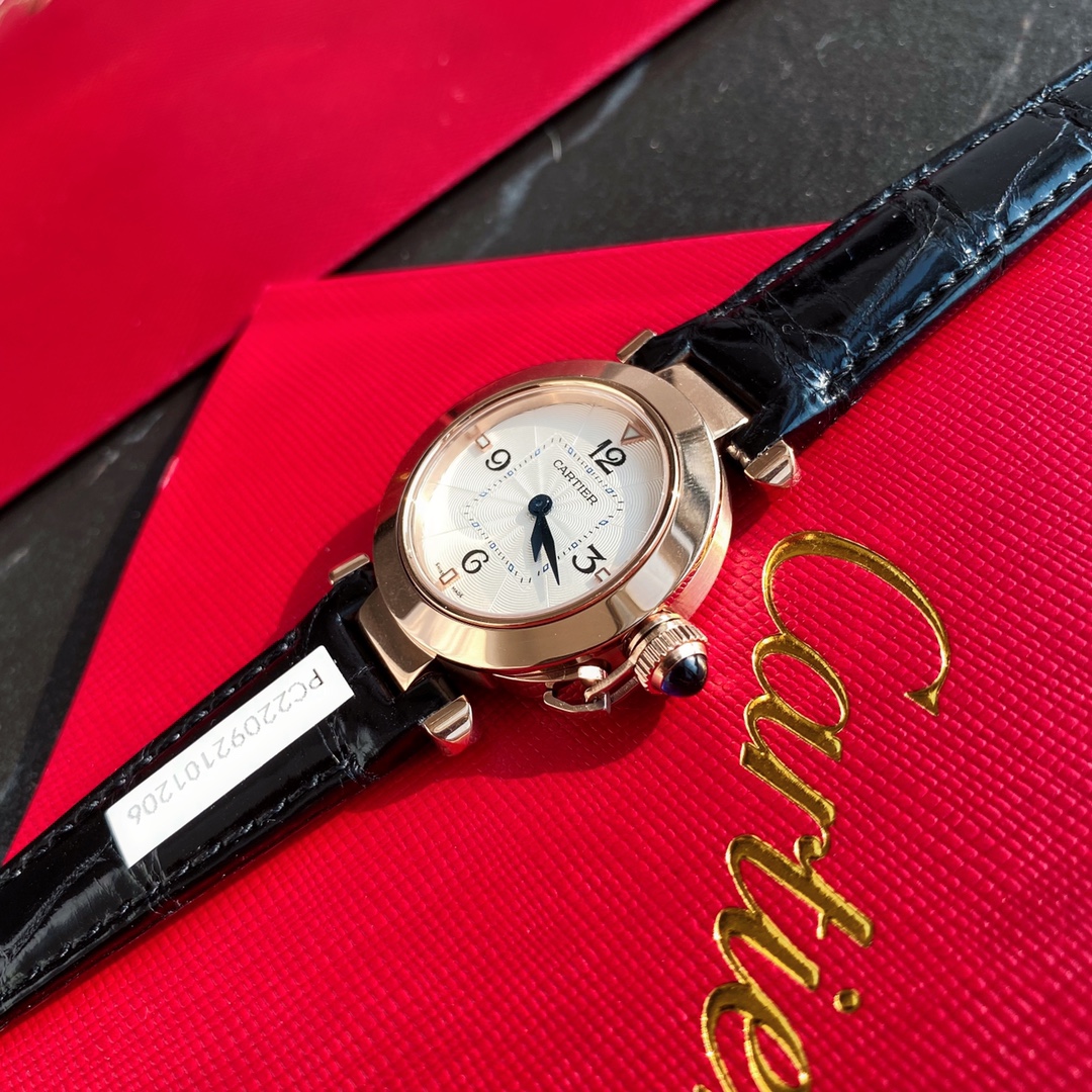 Cartier Pasha 2022 new release. 30mm case, 8.22mm thick, 30m water resistant. 18K gold, Swiss quartz, alligator strap. Unique square-in-circle design, blue spinel crown. Four colors available.