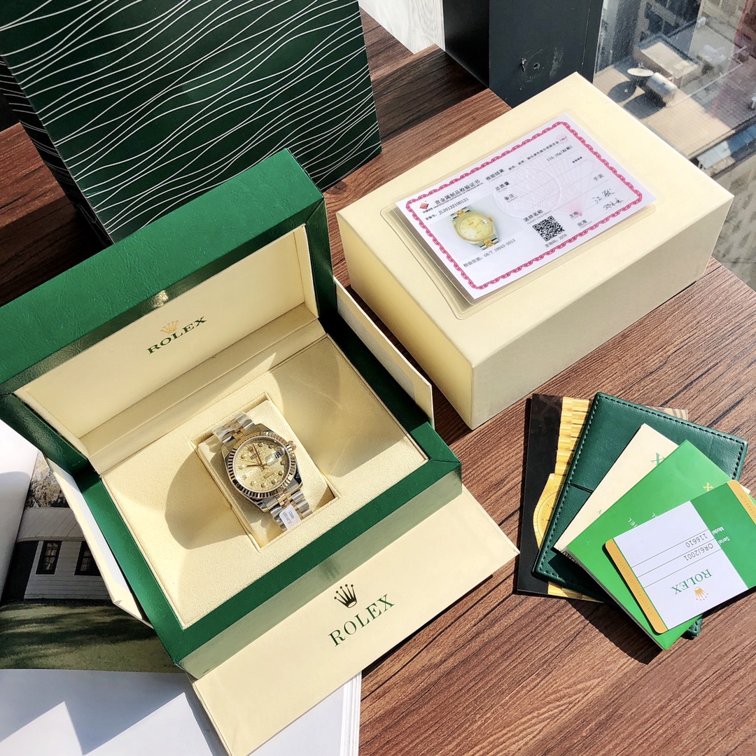 ROLEX - Rolex Datejust! Ladies' 36mm perfect size. Genuine 18K gold-plated, comes with GTC China authoritative certification, 100% real gold verifiable and queryable! The Rolex Datejust series is a model of classic watches, timeless, a classic among classics. Loaded with Swiss ETA-2671 movement, lifetime warranty! The case uses Rolex's unique Rolesor (combination of 904L stainless steel and 18K gold) material. The crown uses the Triplock winding crown, which can be said to be the triple waterproof system specifically developed by Rolex for the Submariner type. The Triplock device consists of 10 different parts; after configuration, simply tightening it makes the Oyster case completely sealed, with sturdy protection comparable to a submarine hatch. The bracelet uses Rolesor material, extremely sturdy and durable, with a metal brushed design showcasing a strong metallic texture! The ergonomically designed lugs and bracelet integrate perfectly, making it very comfortable to wear. Rolex's patented Glidelock clasp, the benefit of this clasp is that divers, even while wearing a wetsuit, can easily adjust the bracelet without any tools; the sturdy toothed component under the clasp can extend the bracelet by 2mm per section, up to 20mm. Sapphire crystal, super strong luminescence, the case and bracelet workmanship and polishing are very fine, everywhere highlighting the classic achieved through details! Comes with a full set of top-tier packaging!
